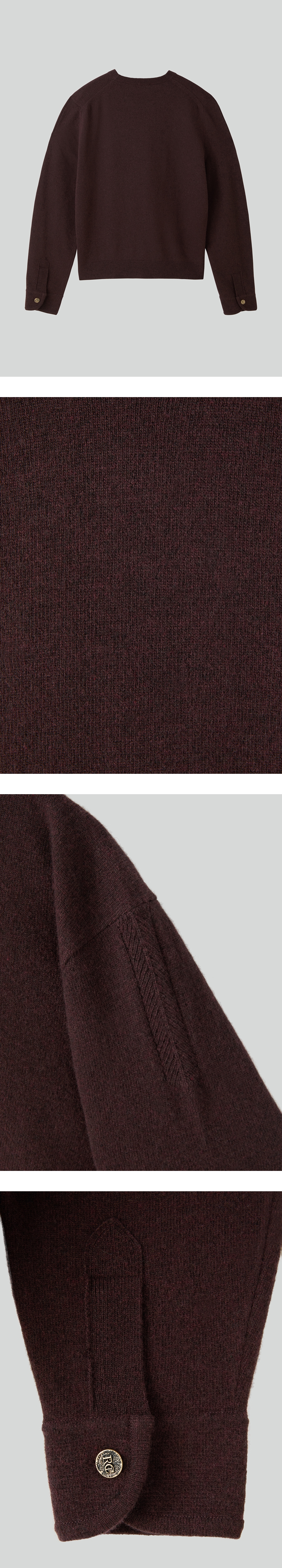 - 셔츠형 커프스 디테일을 차용한 디자인의 니트 탑 - ‘RC’ 로고가 양각된 개발 금속 단추 포인트 - 기본적인 핏의 라운드넥 롱슬리브 실루엣