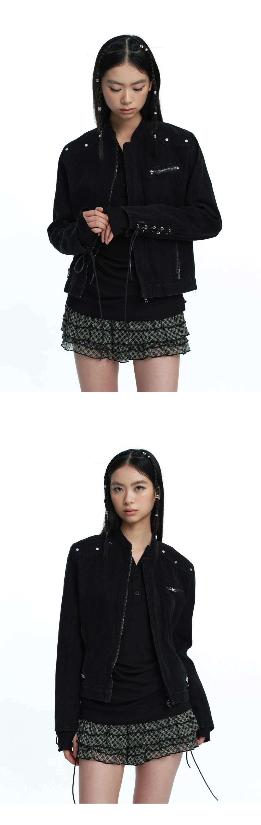 워싱과 그런지 텍스처가 강하게 들어간 데님 라이더 자켓입니다. 사용자의 편한 착용감을 위해 목 부분을 오픈 형태로 만들었으며 다양한 스터드 디테일과 그런지한 원단 끝 처리가 돋보입니다. 소매 부분엔 아일렛과 가죽 끈으로 포인트를 넣어 입체적인 디자인을 완성합니다 Model size : YACO 170cm 47kg / ELDA 167cm 47kg Fitting size : S Material : Cotton 70% / Polyester 25% / Rayon 5%