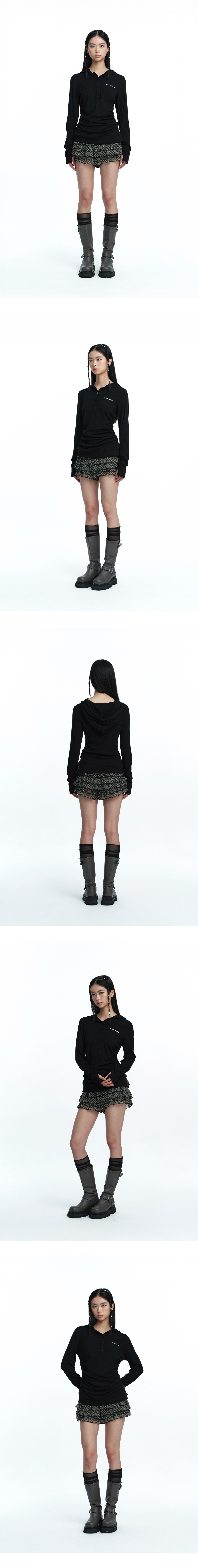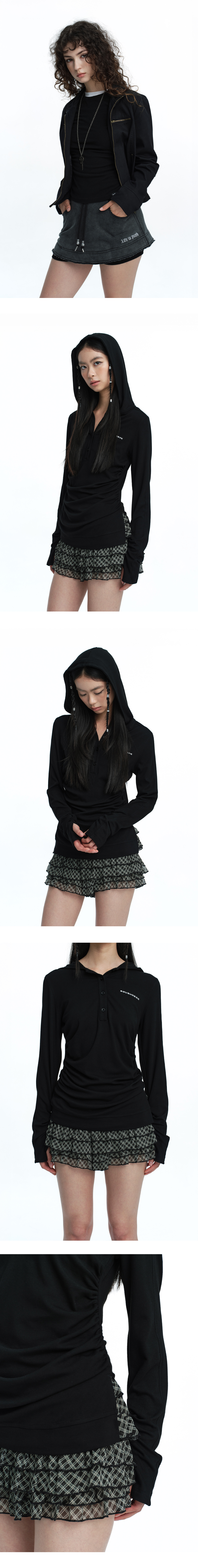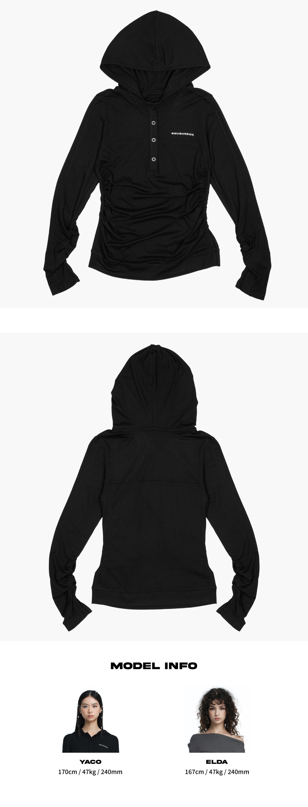 헨리넥 버튼 디테일과 후드가 결합된 롱슬리브 탑입니다. 심플한 실루엣에 사이드 셔링 디테일이 슬림한 라인을 잡아줍니다. 스판이 더해져 뛰어난 신축성과 밑단쪽 트임이 있어 편안한 착용감을 제공합니다. Model size : YACO 170cm 47kg / ELDA 167cm 47kg Fitting size : S Material : Cotton 94% / Span 6%