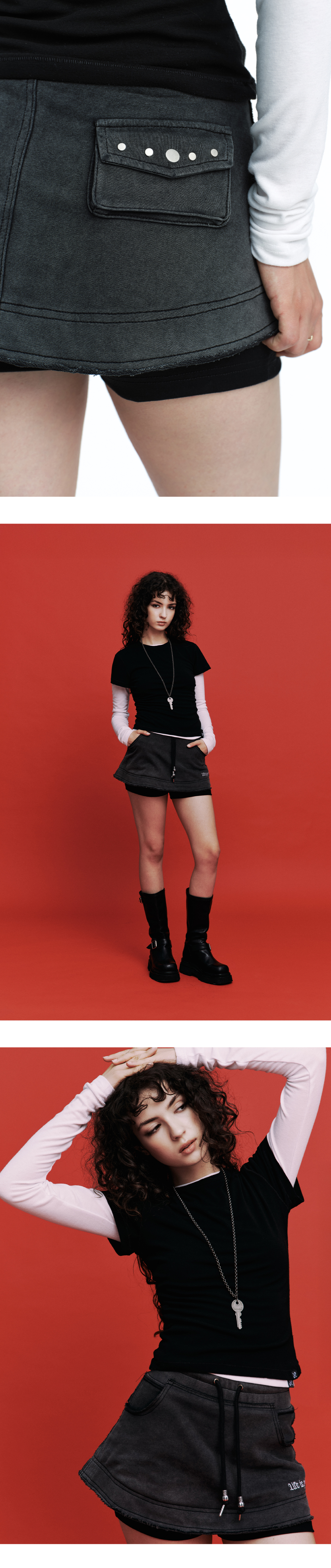 워싱 처리된 원단으로 빈티지한 무드를 살린 스커트-팬츠 아이템입니다. 안쪽에 스커트보다 긴 속바지가 내장되어 레깅스를 레이어드한 듯한 실루엣을 연출합니다. 드로스트링과 포켓 디테일이 더해져 실용성을 높였으며, 밑단의 내추럴 컷팅이 러프한 분위기를 완성합니다. Model size : YACO 170cm 47kg / ELDA 167cm 47kg Fitting size : S Material : Cotton 80% / Polyester 20%