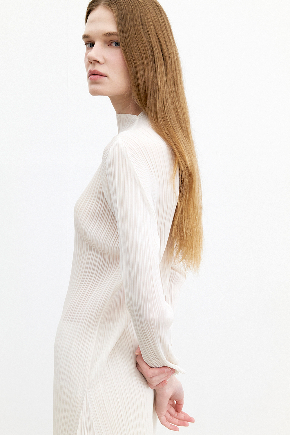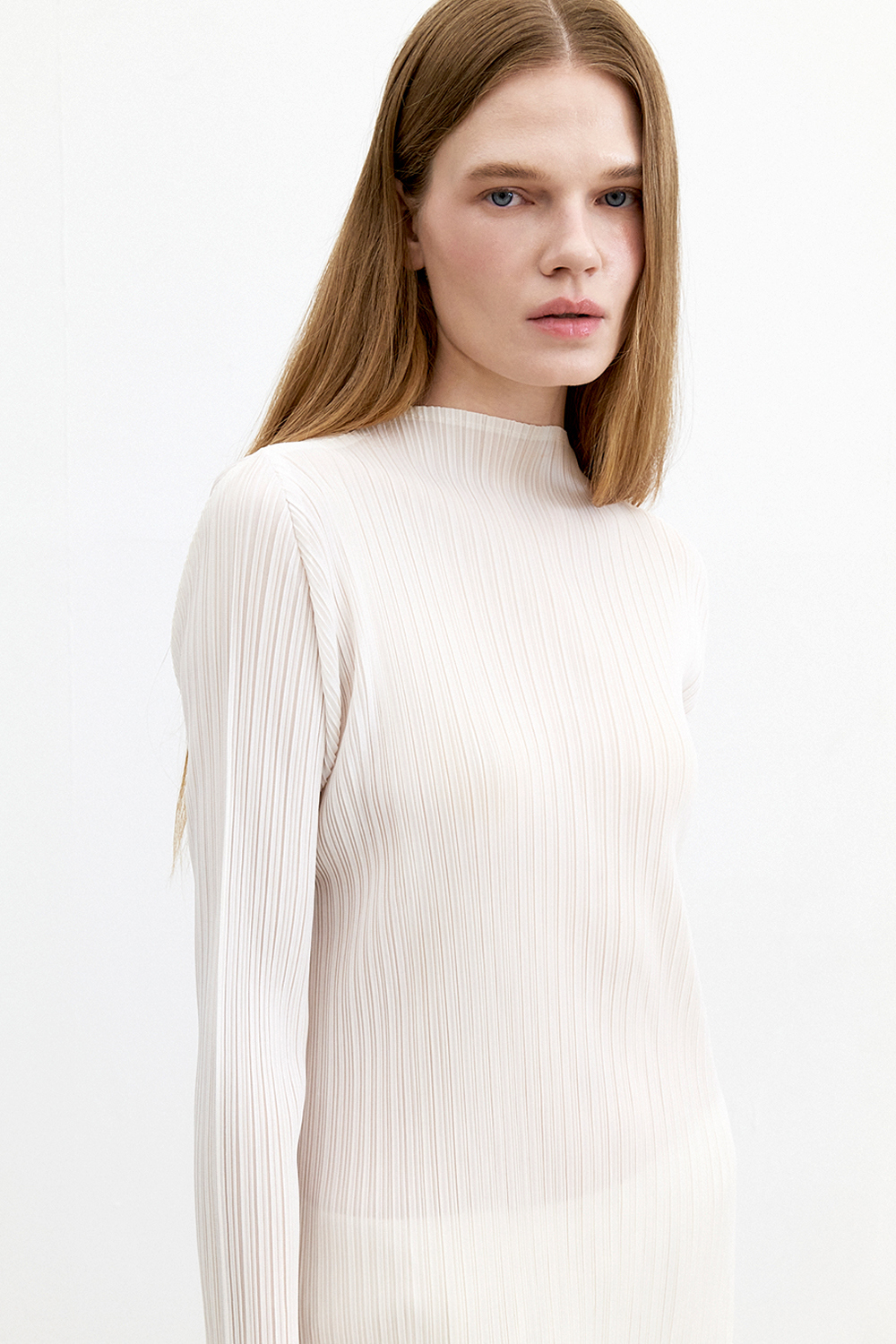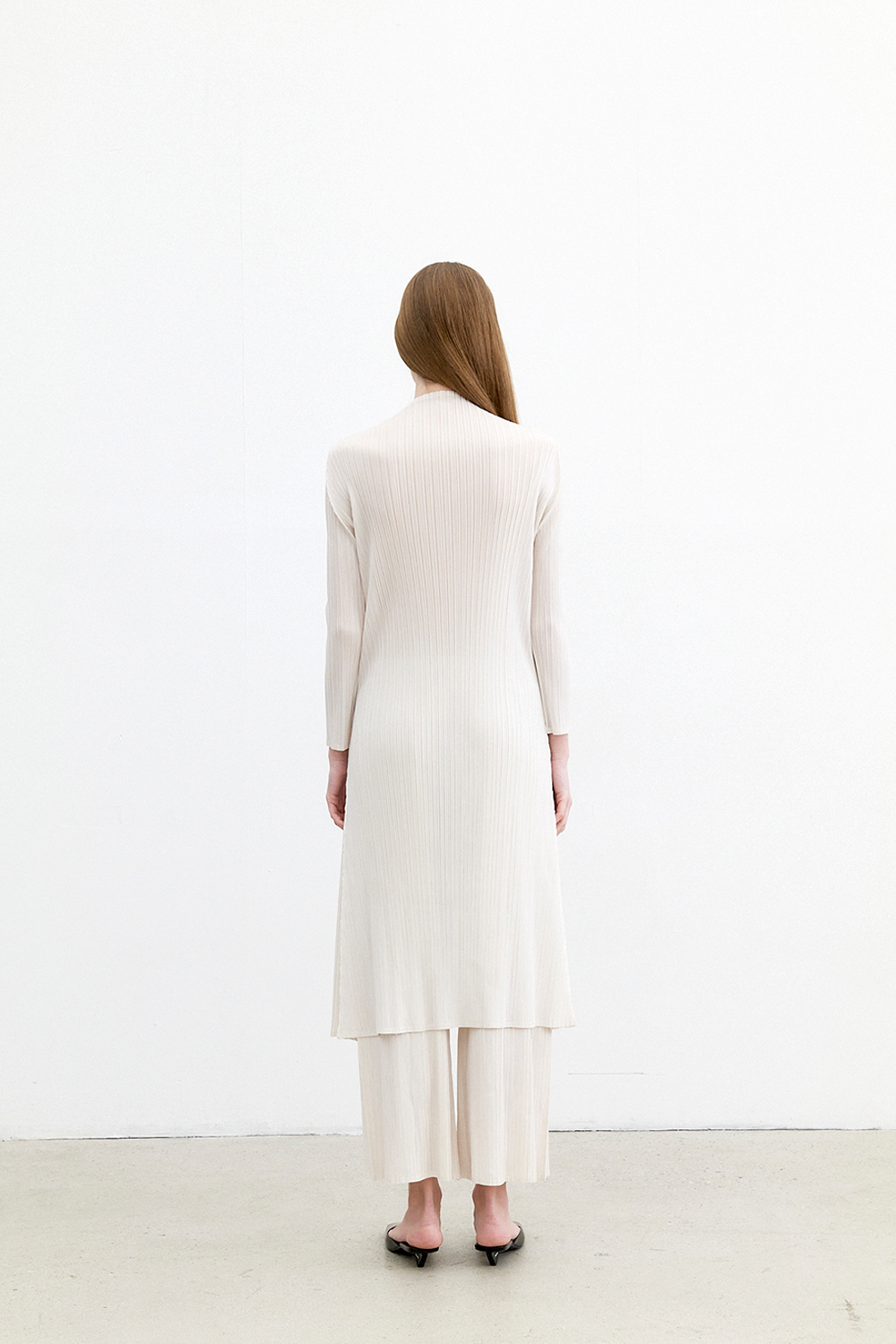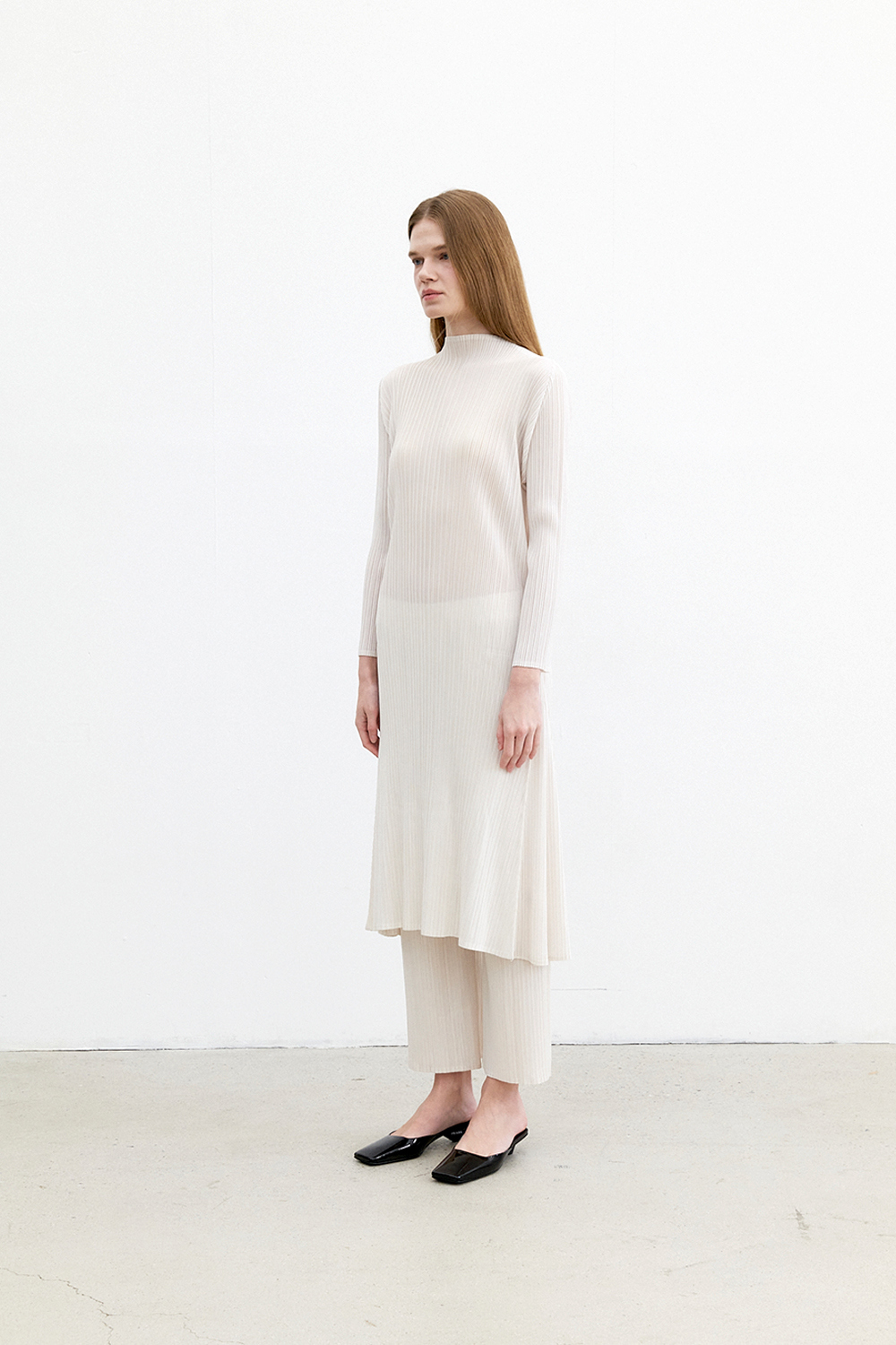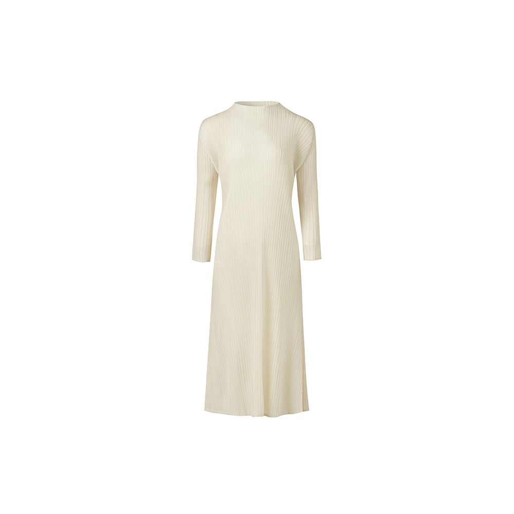 몽플리쎄 반넥 긴소매 베이직 플리츠 원피스 아이보리