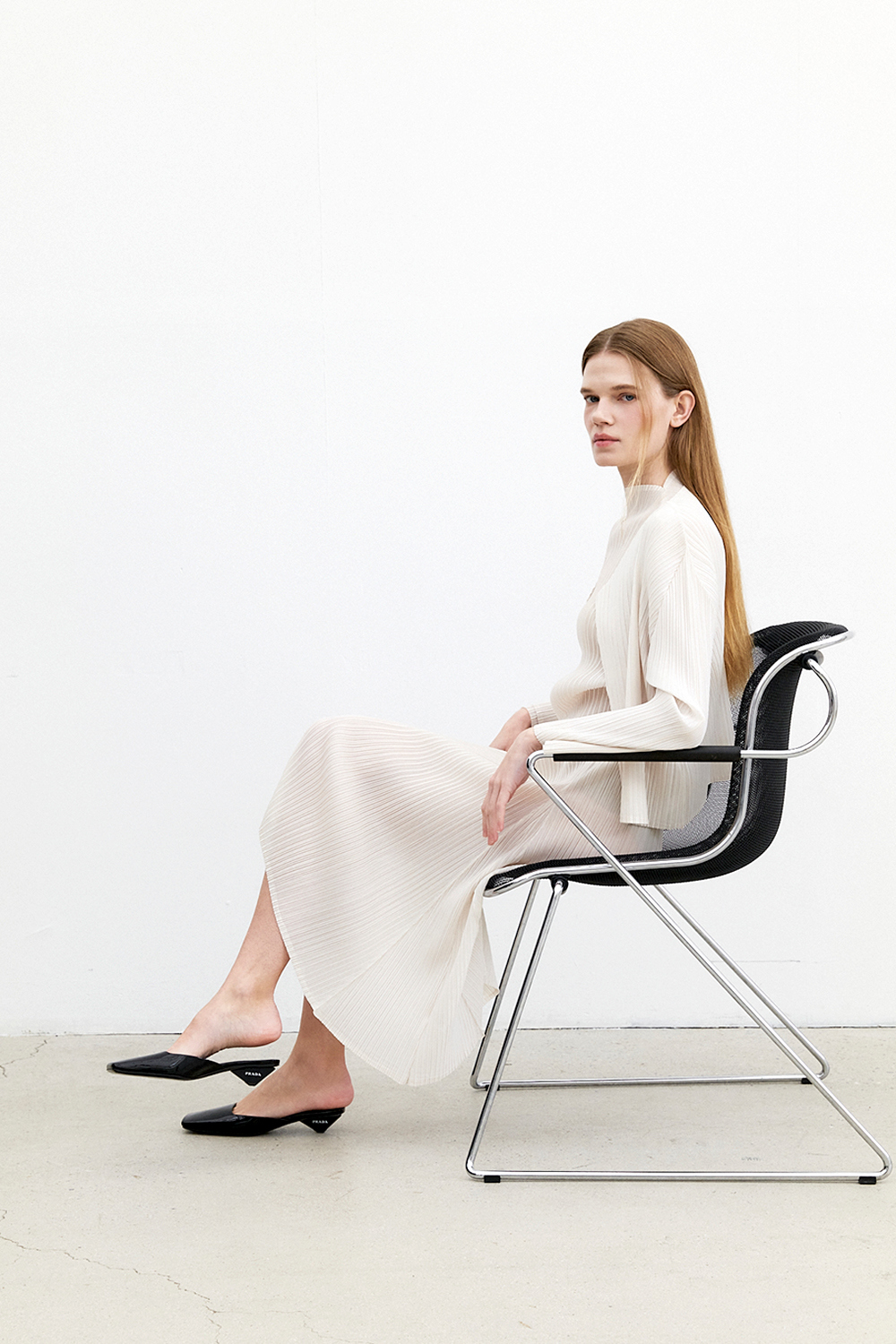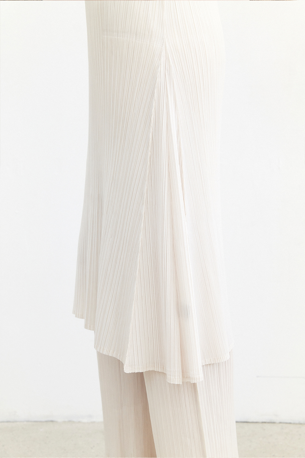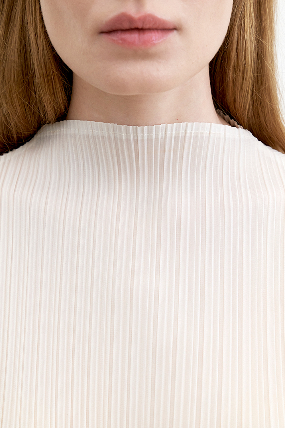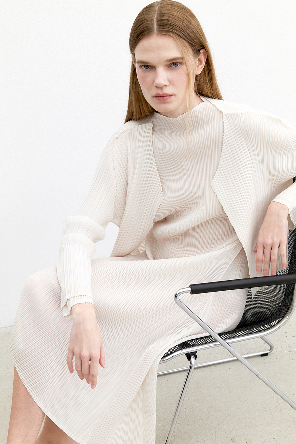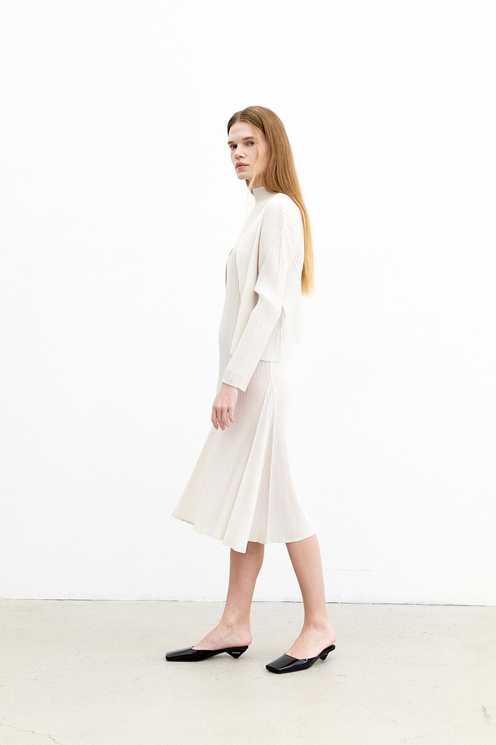 몽플리쎄 반넥 긴소매 베이직 플리츠 원피스 아이보리