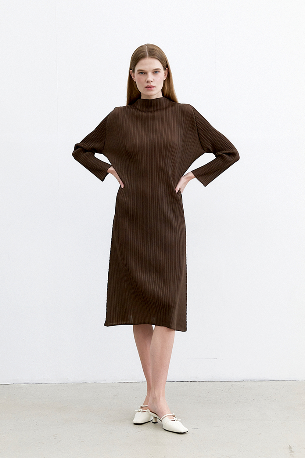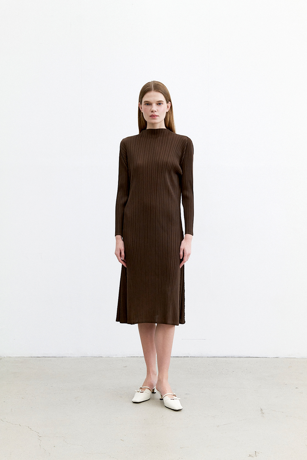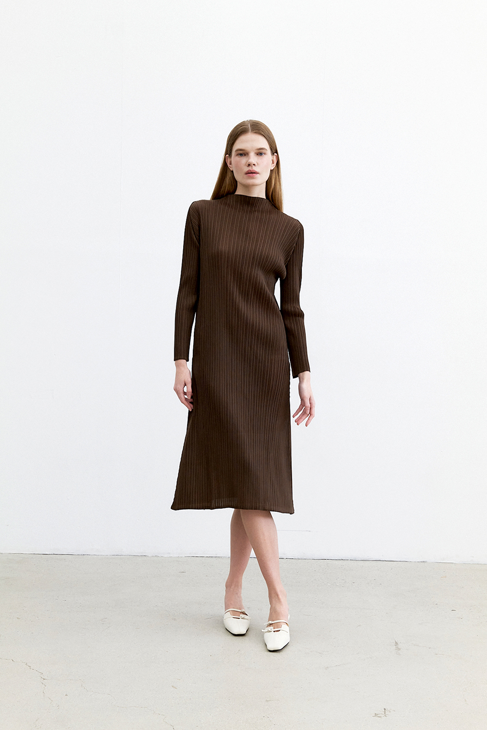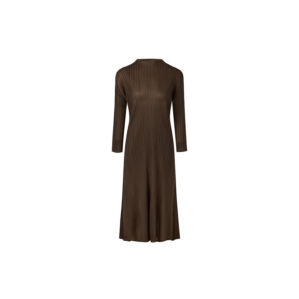 몽플리쎄 반넥 긴소매 베이직 플리츠 원피스 브라운