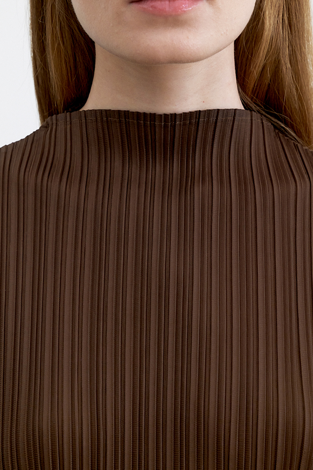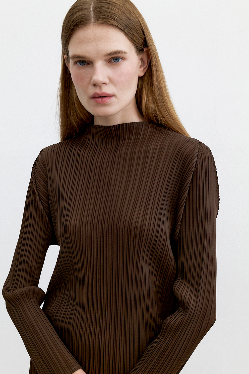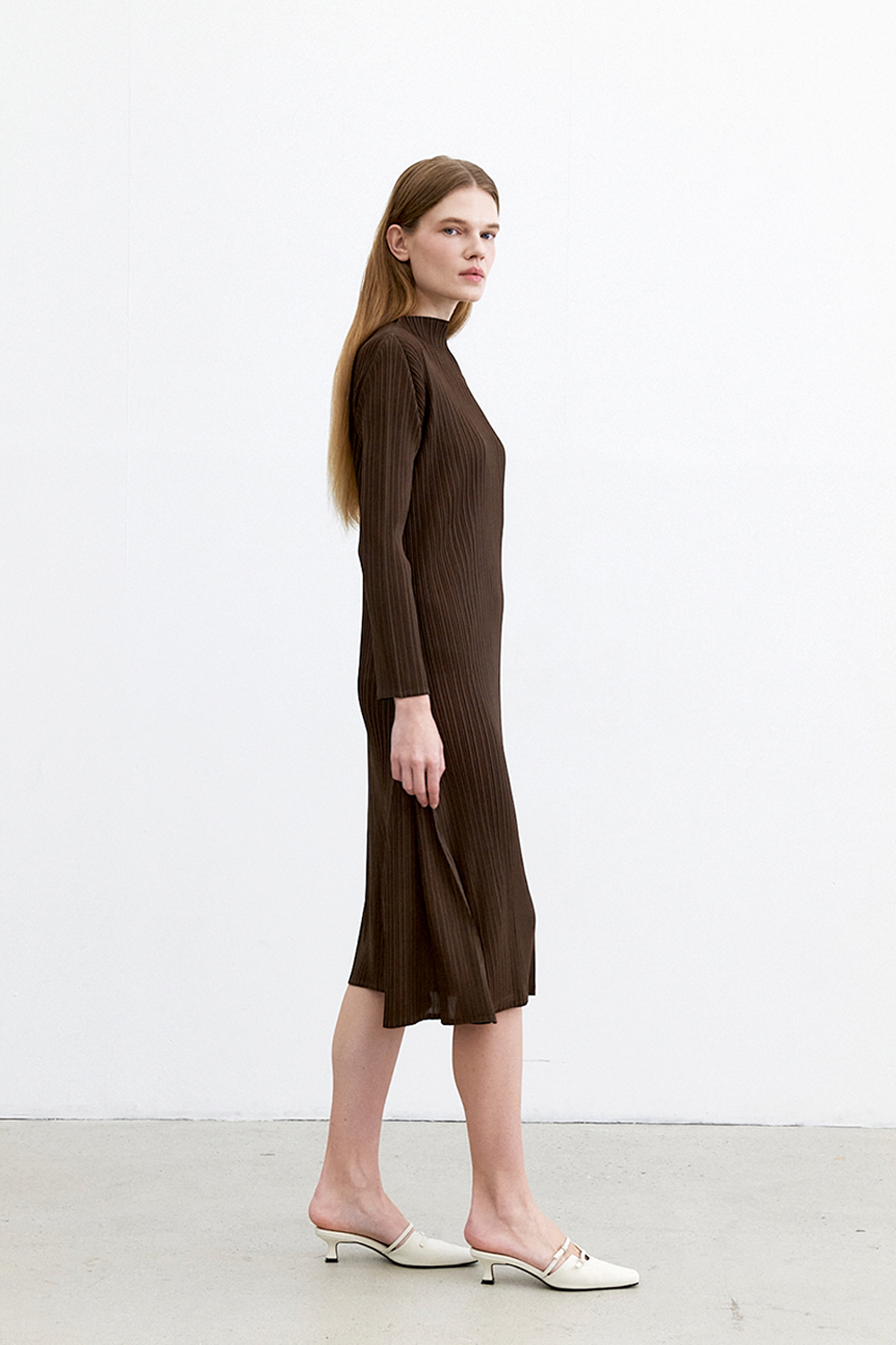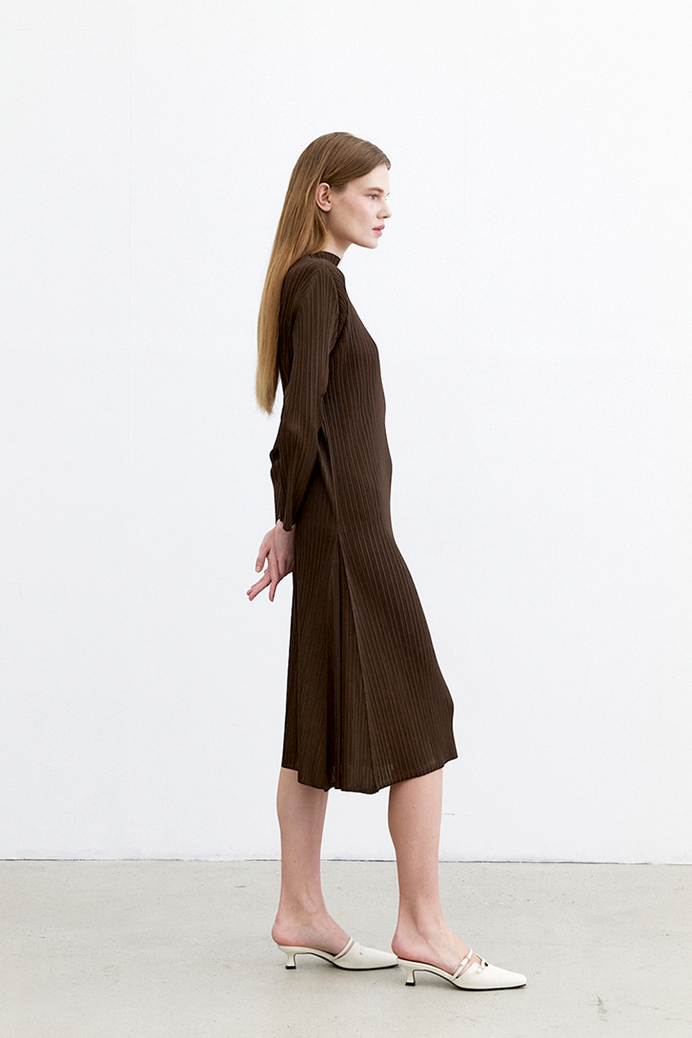 몽플리쎄 반넥 긴소매 베이직 플리츠 원피스 브라운