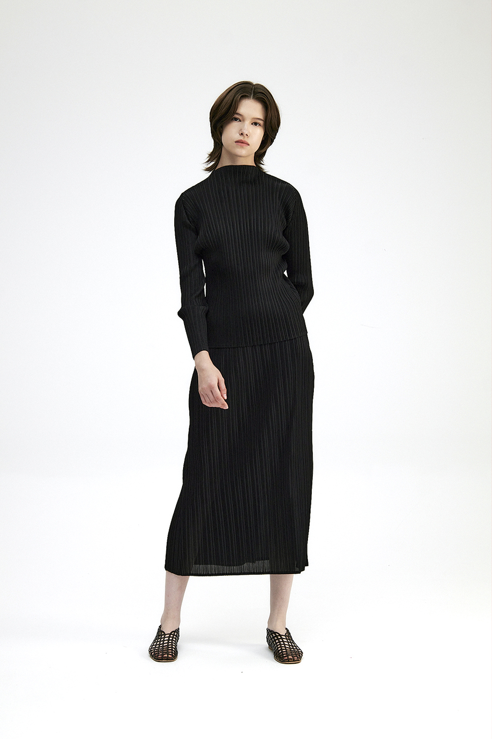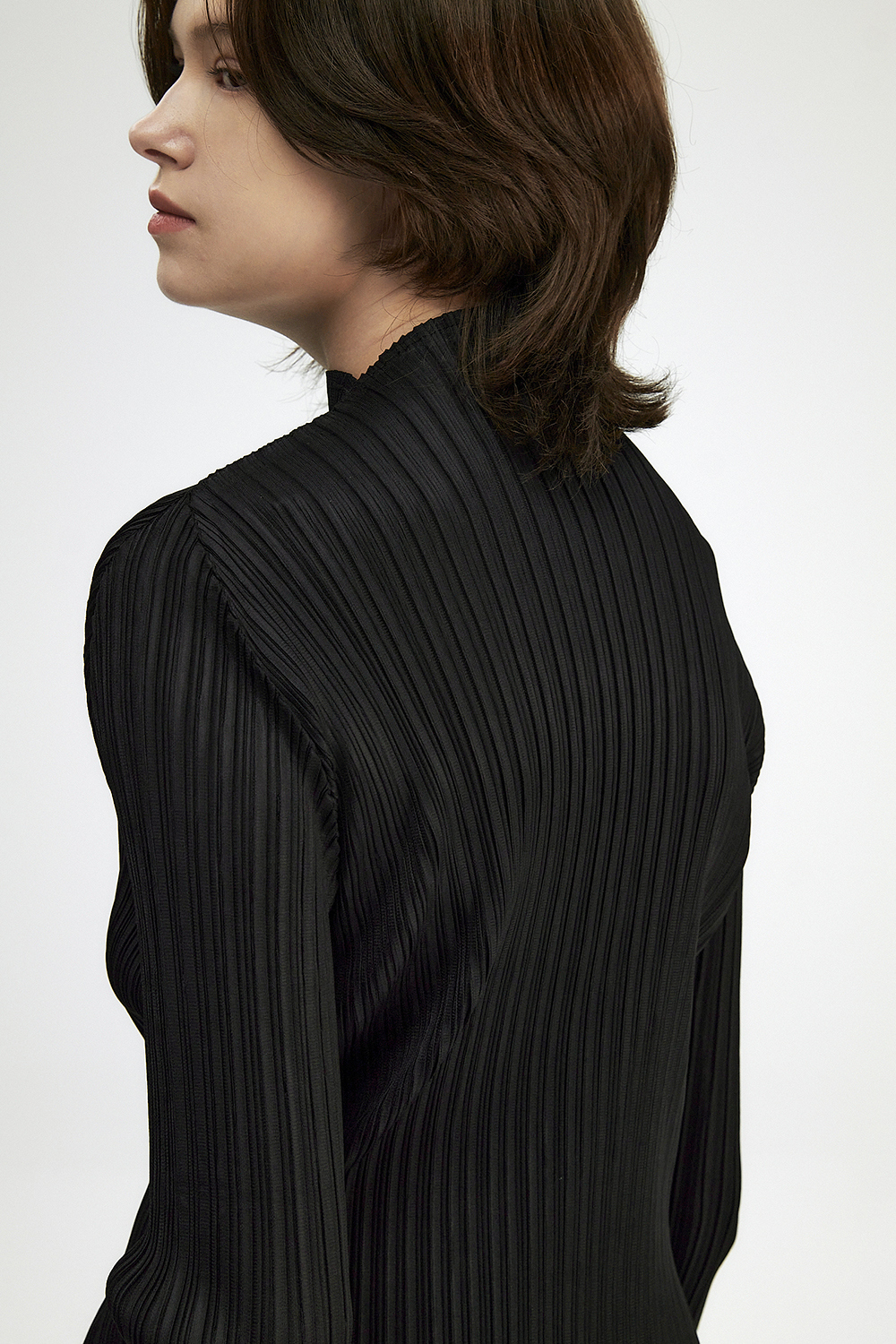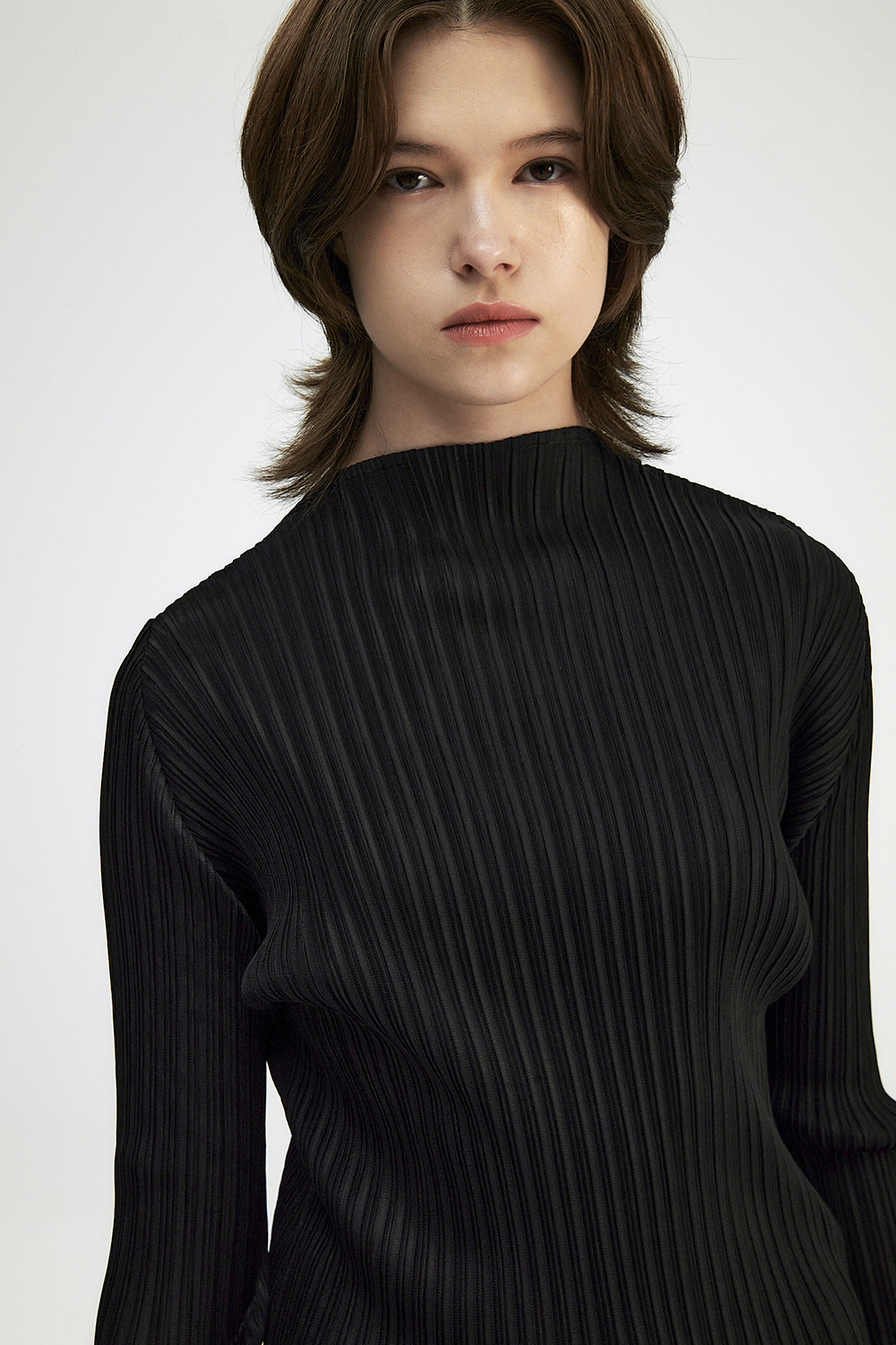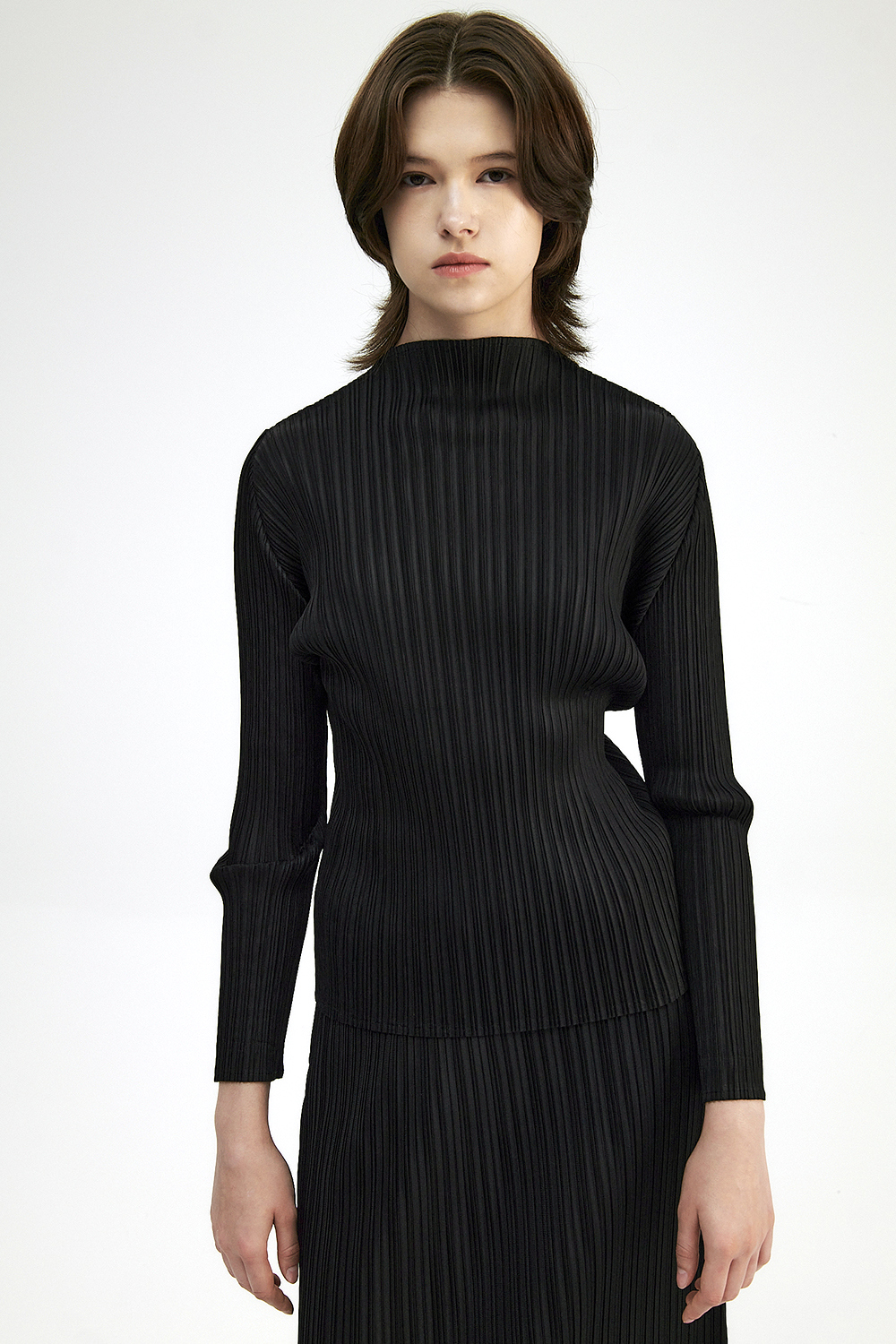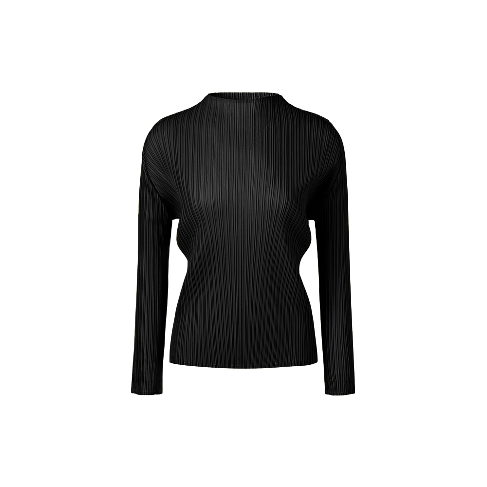 몽플리쎄 여성 반넥 긴소매 플리츠 베이직 티셔츠 블랙