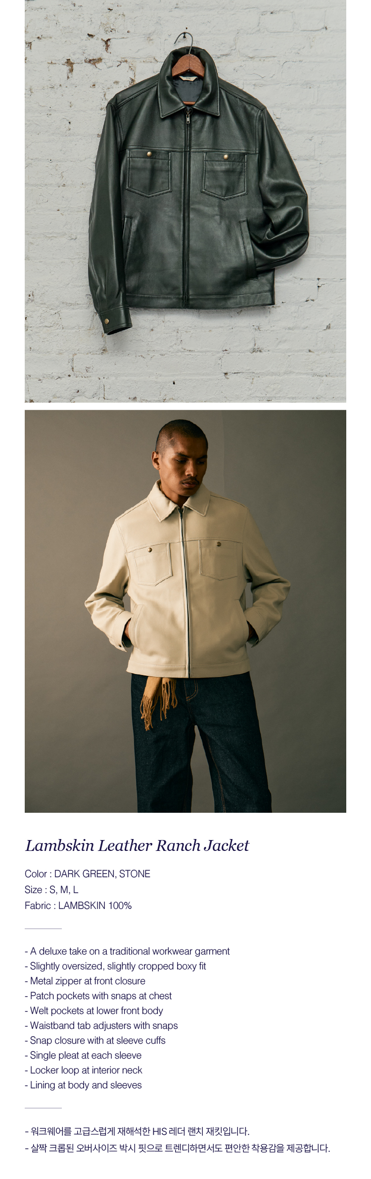 워크웨어를 고급스럽게 재해석한 HIS 레더 랜치 재킷입니다. 살짝 크롭된 오버사이즈 박시 핏으로 트렌디 하면서도 편안한 착용감을 제공합니다.