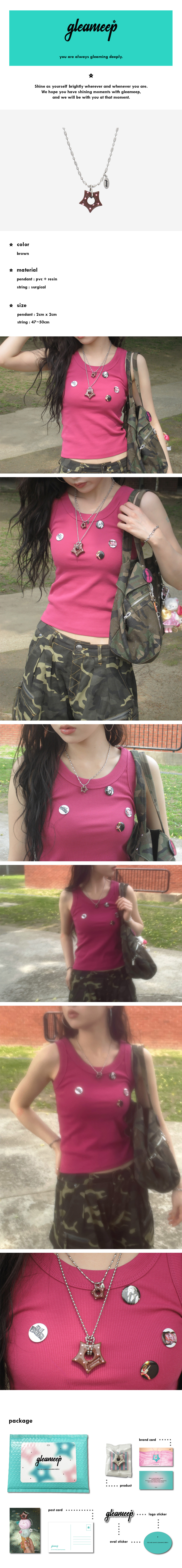 gleaming little star dot necklace는 [gleaming star dot necklace]의 미니 버전으로 도트 무늬와 글리밉의 시그니처 별 모양 그리고 옆쪽에 달린 로고 펜던트가 포인트인 제품입니다.