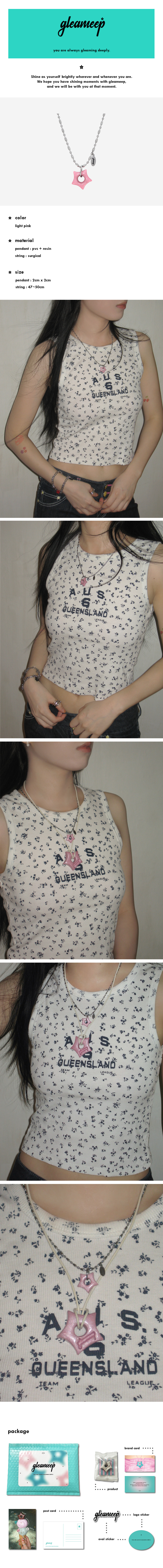 gleameep's necklace series gleaming little star necklace는 글리밉의 첫번째 목걸이 시리즈입니다. gleaming star pendant의 작은 버전 펜던트와 글리밉 로고가 각인된 써지컬펜던트가 포인트입니다.
