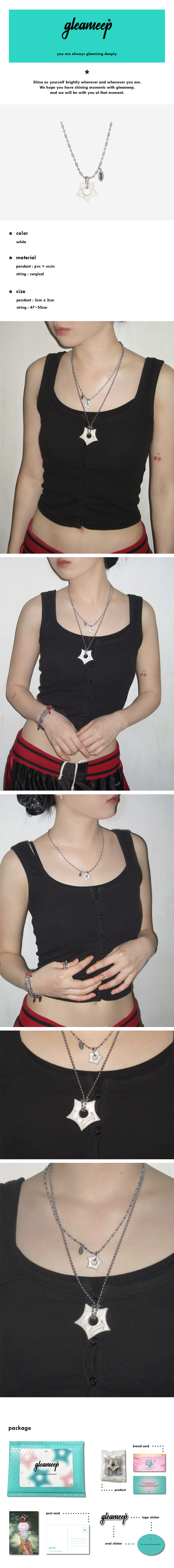gleameep's necklace series gleaming little star necklace는 글리밉의 첫번째 목걸이 시리즈입니다. gleaming star pendant의 작은 버전 펜던트와 글리밉 로고가 각인된 써지컬펜던트가 포인트입니다.