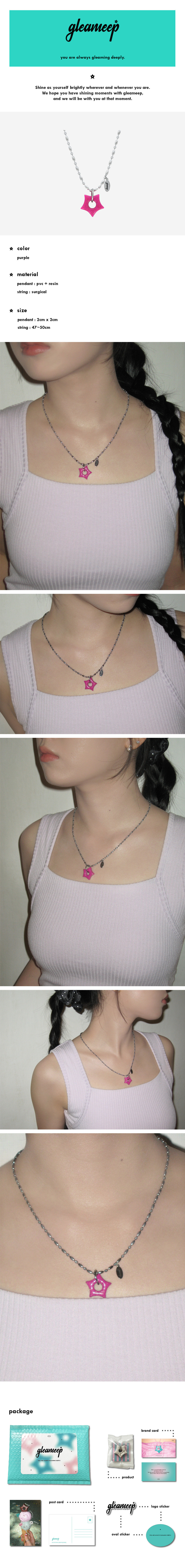 gleameep's necklace series gleaming little star necklace는 글리밉의 첫번째 목걸이 시리즈입니다. gleaming star pendant의 작은 버전 펜던트와 글리밉 로고가 각인된 써지컬펜던트가 포인트입니다.