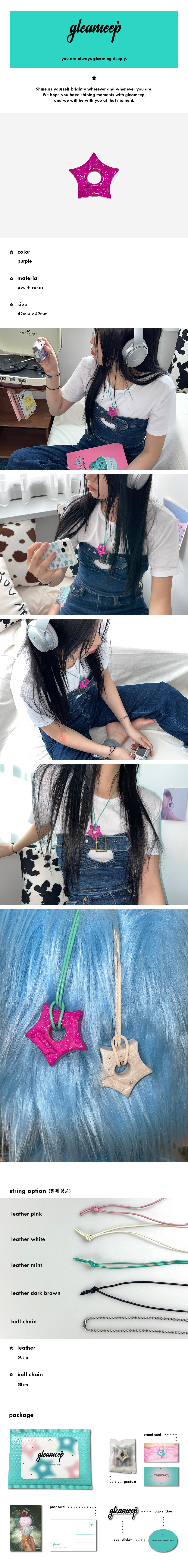 gleameep's first project gleaming star pendant는 스트링 옵션을 추가해 자신만의 목걸이로 커스텀 할 수 있는 형태의 상품입니다. 본 제품은 펜던트 단품으로 구성되어 있으며, 스트링을 추가 구매하셔야 완전한 목걸이 형태로 배송됩니다.