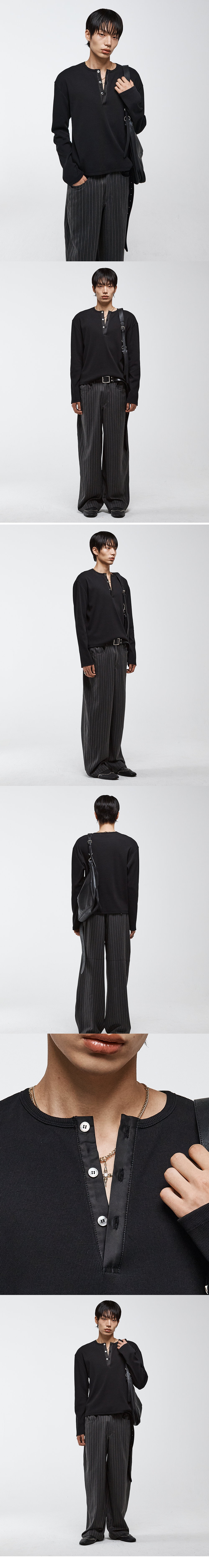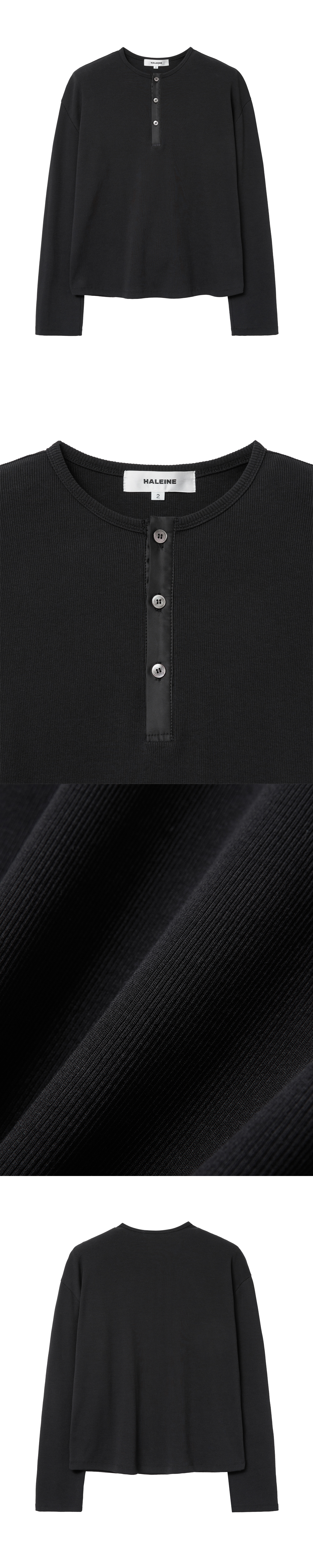 리브드 소재로 제작된 헨리넥 티셔츠입니다. 단작 부분에 새틴 소재를 배색하여 은은한 포인트를 더했으며, 크롭한 기장으로 트렌디한 실루엣을 완성합니다. 심플한 디자인 속에서 소재와 디테일의 대비가 돋보이는 아이템입니다. ※ 워싱 처리된 원단을 사용하여 수축을 최소화하였으나, 원단 특성상 세탁 시 약 1~2cm의 수축이 발생할 수 있습니다. -DETAIL- 리브드 원단 헨리넥 디자인 단작 새틴 배색 크롭 기장 천연 자개 단추