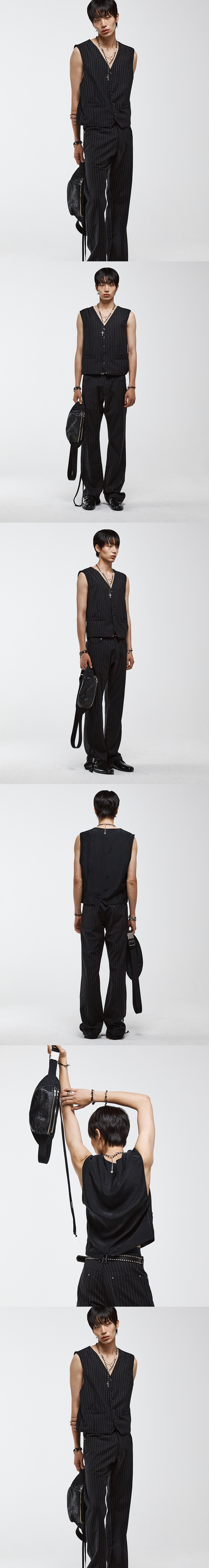 클래식한 울 핀스트라이프 원단으로 제작된 버튼 업 베스트입니다. 브이넥 라인과 직선적으로 떨어지는 실루엣이 단정하면서도 세련된 무드를 완성합니다. 단독 착용은 물론 동일 원단으로 제작된 블레이저와 팬츠와 셋업으로 매치해 아카이브적인 무드를 연출할 수 있습니다. -DETAIL- 울 핀스트라이프 원단 브이넥 디자인 전면 버튼 여밈 천연 소뿔 단추