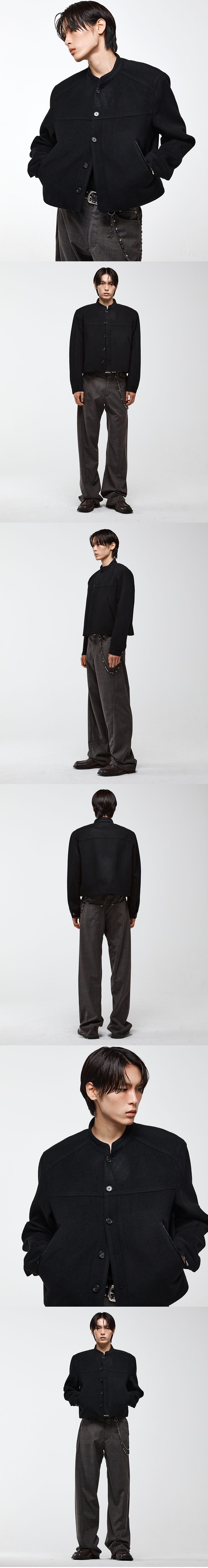 스탠드 칼라와 직선적인 절개 라인으로 구조적인 무드를 담아낸 크롭 재킷입니다. 매트한 터치감의 울 블렌드 원단을 사용하여 단정하고 고급스러운 질감을 보여줍니다. 전면 웰트 포켓에는 인조 누벅 소재 배색을 더해 입체적인 포인트를 주었으며, 버튼 여밈으로 간결하면서도 정제된 인상을 완성합니다. 커프스 여밈에는 자체 개발한 6구 단추와 시그니처 H-스티치 디테일을 더해 위트를 담았고, 크롭 기장이 더해져 세련된 실루엣을 제시합니다. -DETAIL- 스탠드 칼라 프런트 버튼 여밈 누벅 배색 웰트 포켓 커프스 버튼 여밈 자체 개발 6구 단추 & H-스티치 디테일 천연 소뿔 단추 크롭 기장