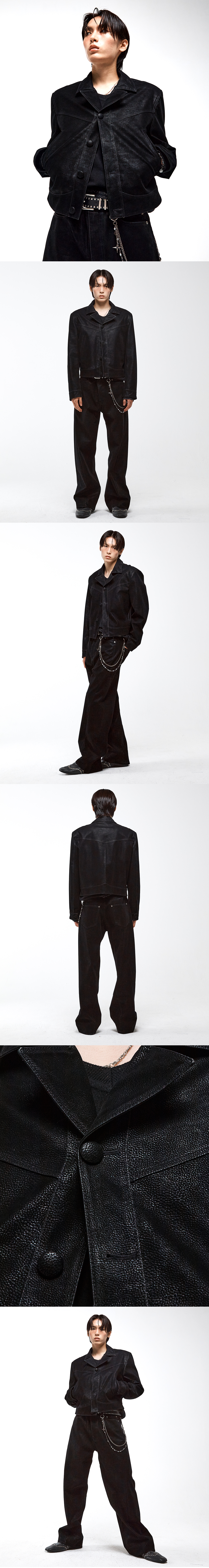 매트한 터치감 위에 은은한 광택이 더해진 인조 누벅 소재로 제작된 크롭 자켓입니다. 프런트·백 V라인 요크 절개와 사선 웰트 포켓으로 구조감을 살렸고, V존을 강조한 노치드 라펠과 동일 원단의 싸개 단추가 정제된 마감으로 완성되었습니다. 크롭 기장과 구조적인 패턴이 어우러져 깔끔한 실루엣을 보여줍니다. -DETAIL- 노치드 라펠 동일 원단 커버드 버튼 여밈 프런트·백 V라인 요크 절개 사선 웰트 포켓 커프스 버튼 여밈 숄더 패드 내장 크롭 기장