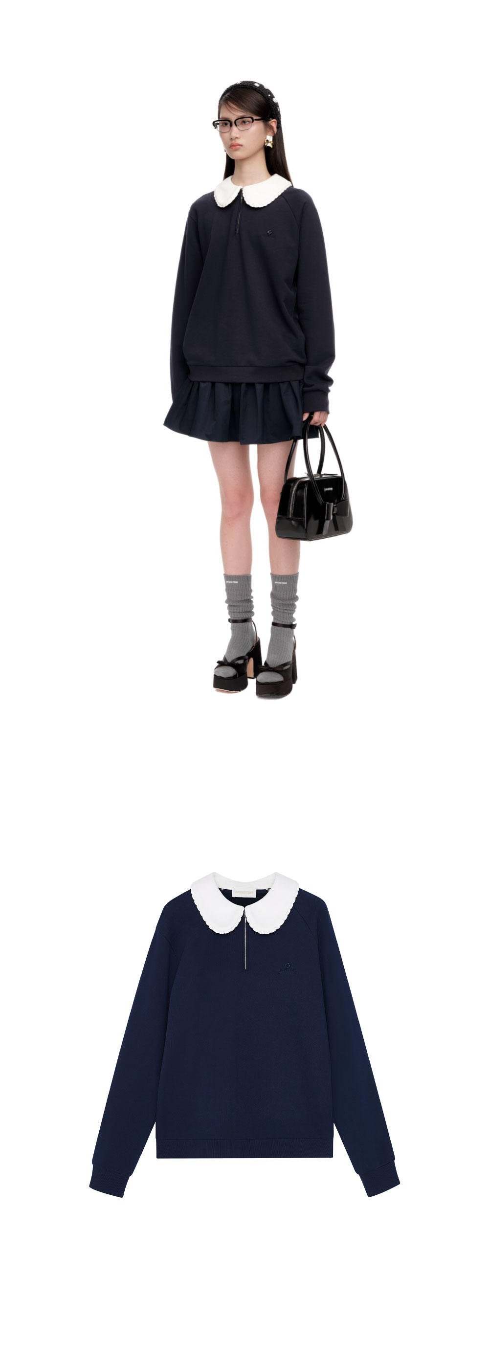 동화적인 무드로 스포티한 감성을 재해석한 슈슈통 우먼 돌 카라 오버사이즈 스웨트셔츠 네이비 블루입니다. - 둥근 피터팬 칼라 디자인 - 손바느질 초승달 레이스 트리밍 - 전면 가슴 자수 & 레진 로고 디테일 - 칼라 중앙 지퍼 여밈 - 클래식한 캐주얼 감성