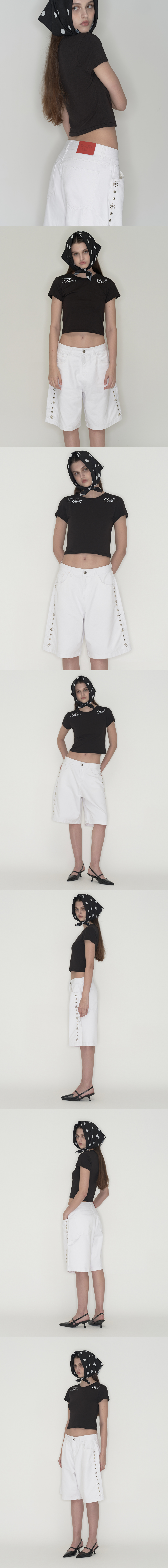 양쪽 어깨에 있는 떨스티클럽 로고가 포인트 유연한 원단감과 베이직한 아웃핏의 세미크롭 티셔츠 과하지 않은 세미 크롭라인 좁지않은 숄더와 네크라인으로 답답하지 않아보이는 아웃핏