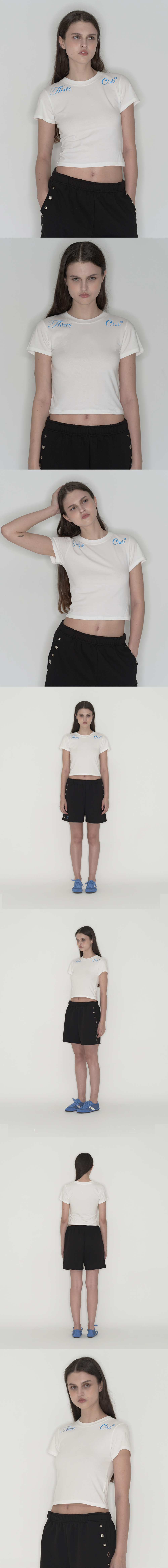 양쪽 어깨에 있는 떨스티클럽 로고가 포인트 유연한 원단감과 베이직한 아웃핏의 세미크롭 티셔츠 과하지 않은 세미 크롭라인 좁지않은 숄더와 네크라인으로 답답하지 않아보이는 아웃핏