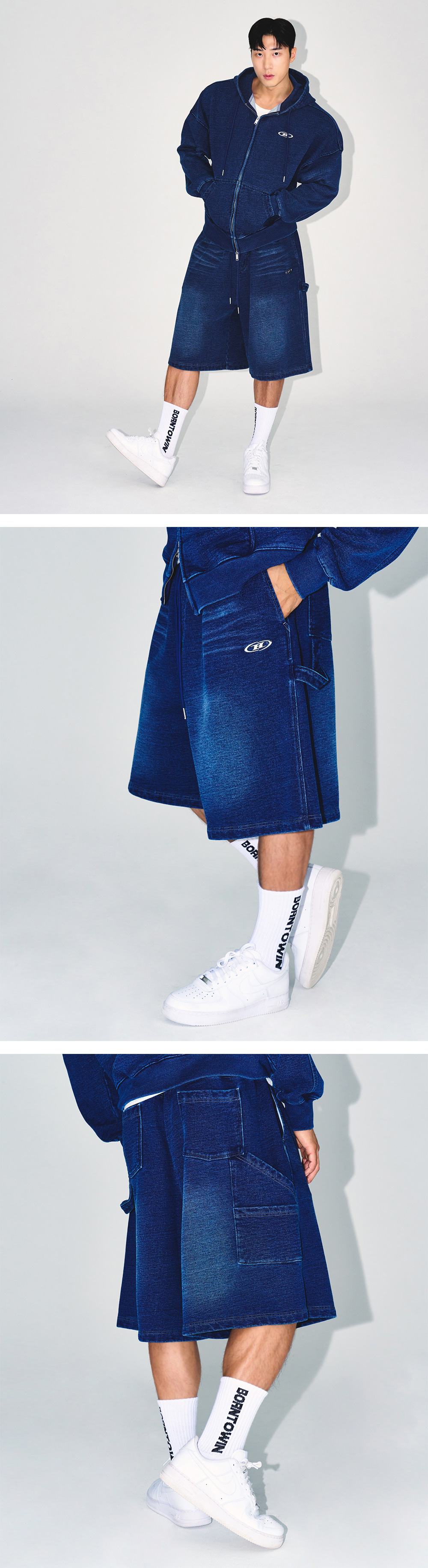 [DETAILS] * 데님 라이크 버뮤다 팬츠 - 데님 라이크 코튼 헤비쮸리 원단 - 크롬 B 로고 포인트 - 카펜터 디테일 - 버뮤다 핏 숏츠 Material : Cotton 100% Fitting : HJ 1 Size, 180cm, 90kg