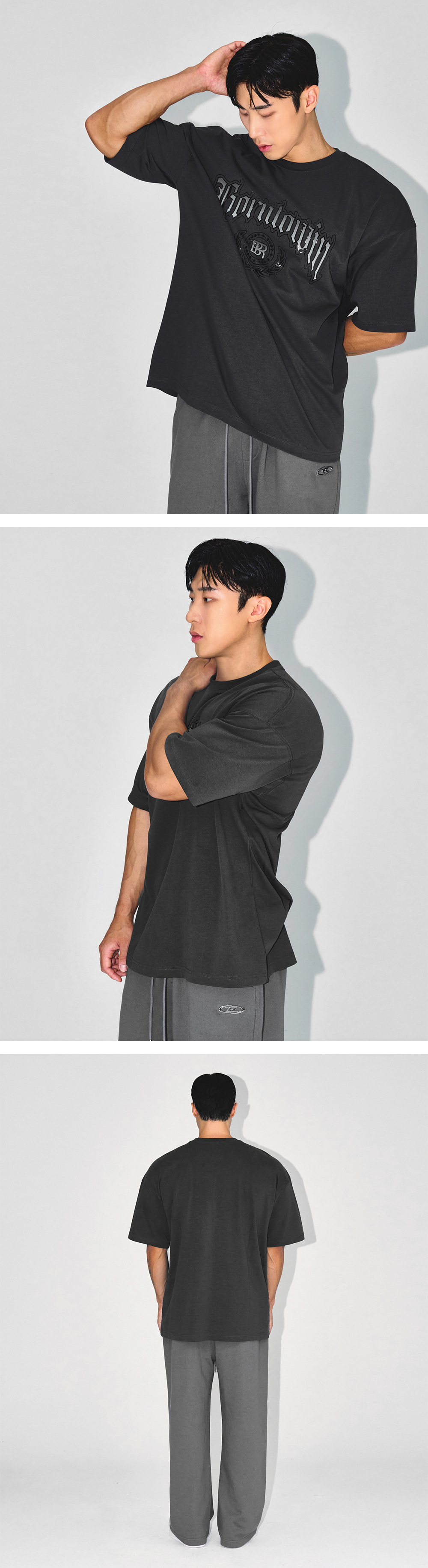 [DETAILS] * 엠블럼 로고 세미 오버핏 티셔츠 - Cotton 100% 원단 - 모노톤 레터링 로고 포인트 - 잦은 세탁에도 늘어남 없는 어깨 모빌론 테이핑 - 세미 오버핏 Material : Cotton 100% Fitting : HJ 3 Size, 180cm, 90kg
