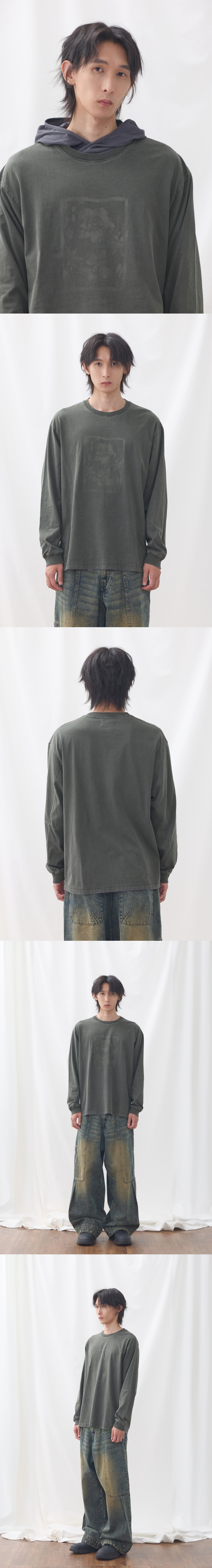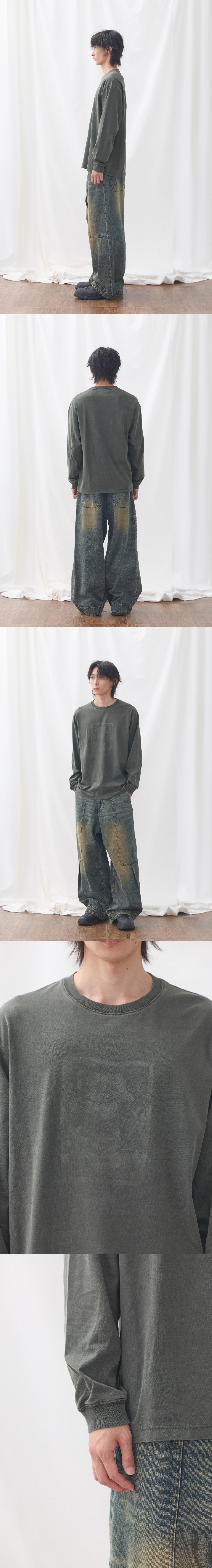 SQM/210g 적당한 두께감의 20수 싱글 원단을 사용하였습니다. 피그먼트 다잉을 통해 빈티지한 색감을 표현하였습니다. 소매에는 자연스러운 실루엣을 연출해주는 1x1 시보리 적용하였습니다. 밑단에는 일반적인 티셔츠의 봉제법과 다른 수소봉제 봉제 방법을 적용하여 차별화된 포인트를 추가하였습니다. 핏은 호불호가 없는 세미오버핏으로 다양한 코디에 활용 가능합니다. Shell : Cotton 100% SIZE INFO S : 총장 69.5, 어깨단면 54, 가슴단면 57, 소매길이 60, 밑단단면 56.5 M : 총장 71.5, 어깨단면 56, 가슴단면 59.5, 소매길이 61, 밑단단면 59 L : 총장 73.5, 어깨단면 58, 가슴단면 62, 소매길이 62, 밑단단면 61.5 MODEL INFO Model (Men1) : 184cm, 상의 M사이즈 하의 48 착용 Model (Men2) : 183cm, 상의 M사이즈 하의 48 착용