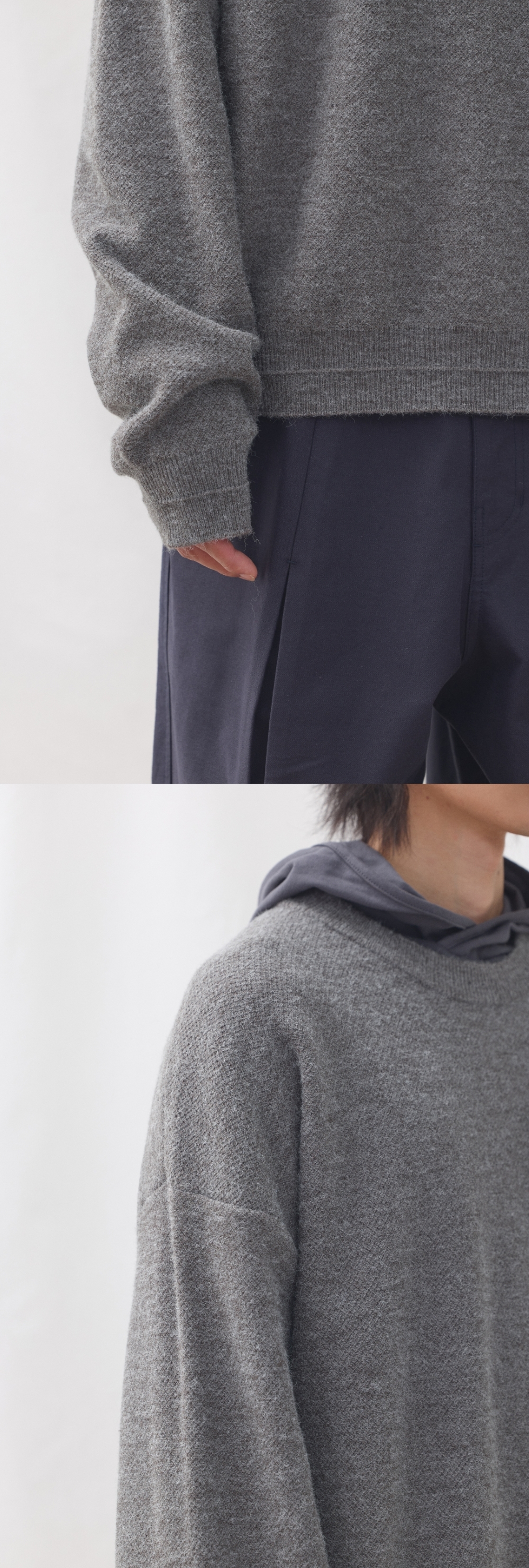 보온성이 좋은 아크릴, 나일론 혼방 원사를 사용하였습니다. 전체 중량을 621g으로 편직하여 간절기에 착용하기에 두께감이 적당하며 겨울에는 이너로 활용 가능합니다. 와플 조직으로 편직하여 착용시 늘어남을 최소화 하였습니다. 소매와 밑단 RIB 부분에는 빨래판을 형상하는 디테일을 추가하여 포인트를 주었습니다. Shell : Acrylic 45% Nylon 30% Polyester 25% SIZE INFO S : 총장 62, 어깨단면 65, 가슴단면 62.5, 소매길이 56, 밑단단면 45 M : 총장 64, 어깨단면 66.5, 가슴단면 64.5, 소매길이 57, 밑단단면 47 L : 총장 66, 어깨단면 68, 가슴단면 66.5, 소매길이 58, 밑단단면 49 MODEL INFO Model (Men1) : 184cm, 상의 M사이즈 하의 48 착용 Model (Men2) : 183cm, 상의 M사이즈 하의 48 착용