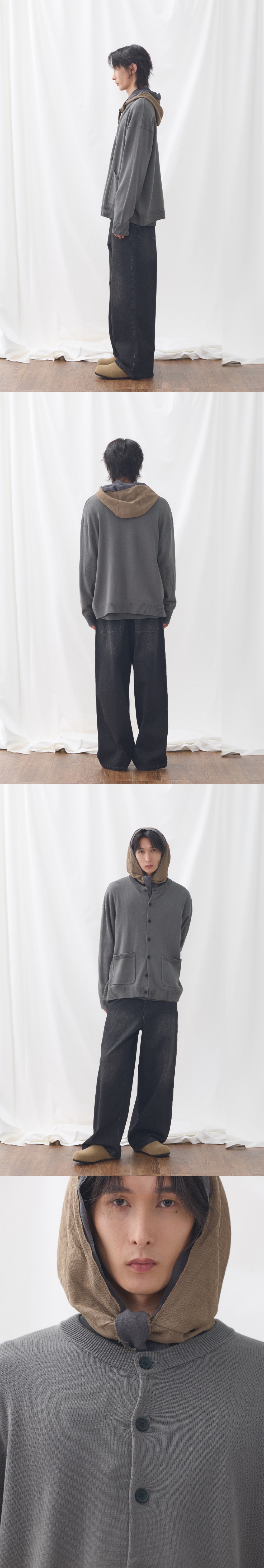 보온성이 좋은 아크릴, 코튼 혼방 원사를 사용하였습니다. 전체 중량을 604g으로 편직하여 간절기에 착용하기에 두께감이 적당하며 겨울에는 이너로 활용 가능합니다. 라운드넥 형태의 가디건으로 디자인하여 다양한 스타일링이 가능합니다. 소매 팔꿈치에는 패치형태로 포인트를 주었습니다. Shell : Acrylic 55% Cotton 45% SIZE INFO S : 총장 64.5, 어깨단면 57.5, 가슴단면 64, 소매길이 56, 밑단단면 51.5 M : 총장 66.5, 어깨단면 59.5, 가슴단면 66.5, 소매길이 57, 밑단단면 54 L : 총장 68.5, 어깨단면 61.5, 가슴단면 69, 소매길이 58, 밑단단면 56.5 MODEL INFO Model (Men1) : 184cm, 상의 M사이즈 하의 48 착용 Model (Men2) : 183cm, 상의 M사이즈 하의 48 착용