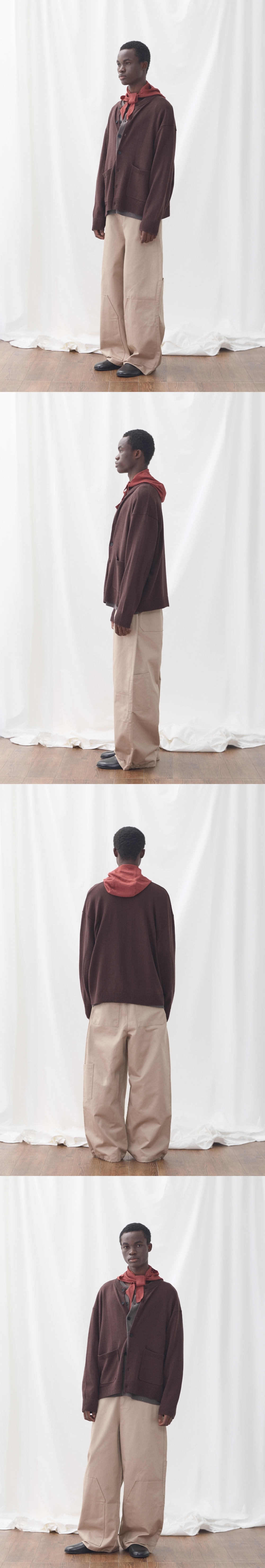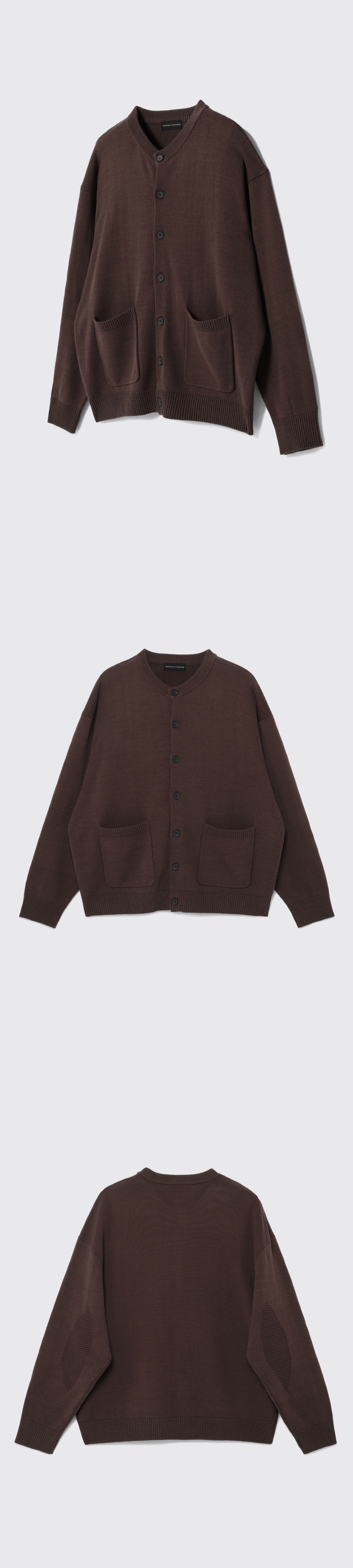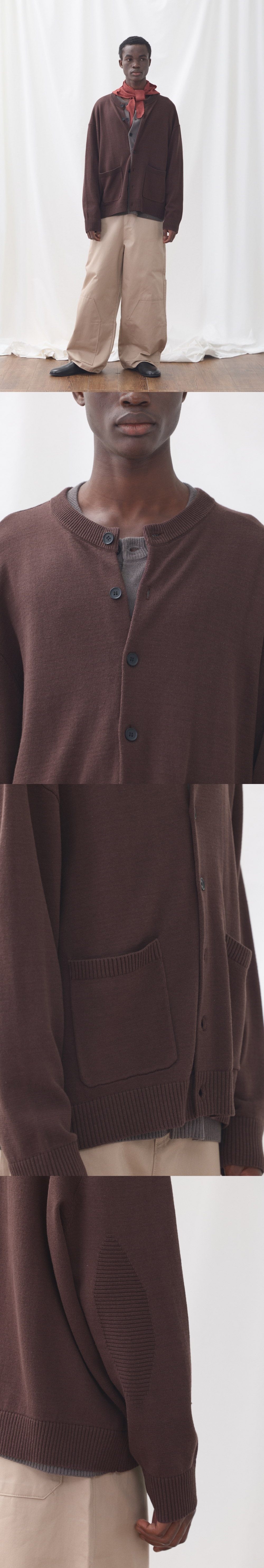 보온성이 좋은 아크릴, 코튼 혼방 원사를 사용하였습니다. 전체 중량을 604g으로 편직하여 간절기에 착용하기에 두께감이 적당하며 겨울에는 이너로 활용 가능합니다. 라운드넥 형태의 가디건으로 디자인하여 다양한 스타일링이 가능합니다. 소매 팔꿈치에는 패치형태로 포인트를 주었습니다. Shell : Acrylic 55% Cotton 45% SIZE INFO S : 총장 64.5, 어깨단면 57.5, 가슴단면 64, 소매길이 56, 밑단단면 51.5 M : 총장 66.5, 어깨단면 59.5, 가슴단면 66.5, 소매길이 57, 밑단단면 54 L : 총장 68.5, 어깨단면 61.5, 가슴단면 69, 소매길이 58, 밑단단면 56.5 MODEL INFO Model (Men1) : 184cm, 상의 M사이즈 하의 48 착용 Model (Men2) : 183cm, 상의 M사이즈 하의 48 착용