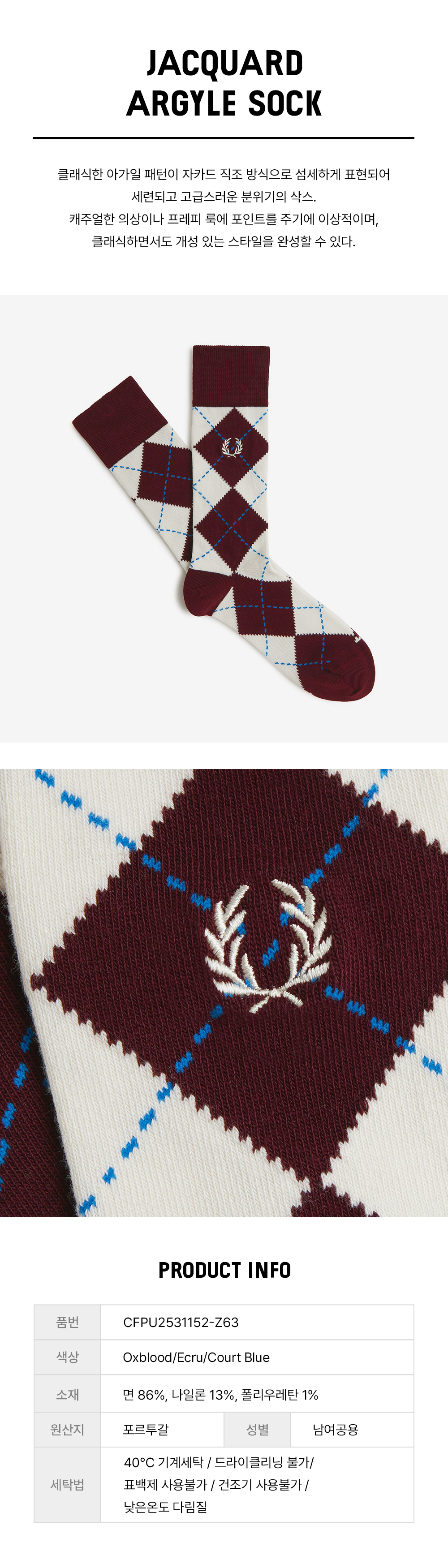 프레드 페리 자가드 아가일 삭스 옥스블러드 에크루 코트블루