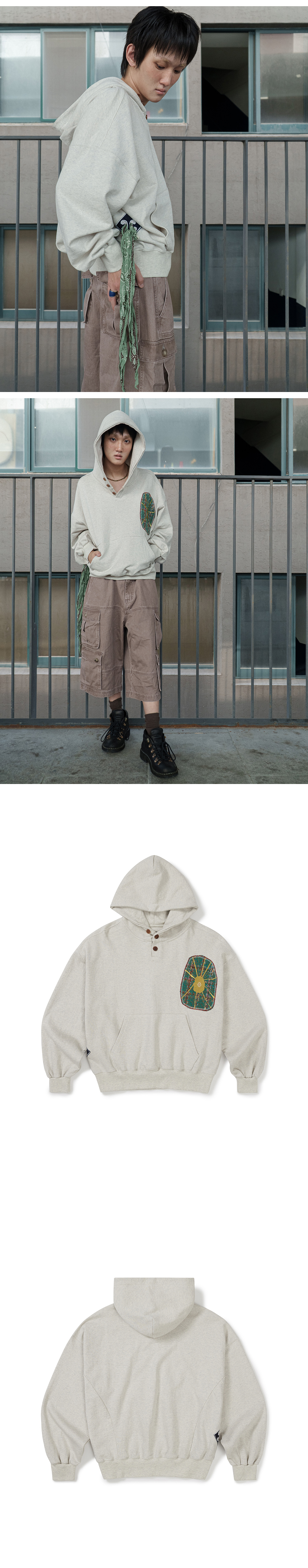 Product Info. - 워싱 가공을 거쳐 탄탄하지만 소프트한 스킨십의 750g 헤비쮸리 소재 - 여유로운 착용감의 릴렉스드 핏 실루엣, 경쾌한 기장감의 후드 티셔츠 - 전면 버튼 여밈, Real Cow Horn Button 사용 - 프런트 빈티지 무드의 패치워크 자수 디자인 - 래시 탭 디테일을 재해석한 사이드 패치워크 자수 디자인 *MODEL 176cm, wearing size 01