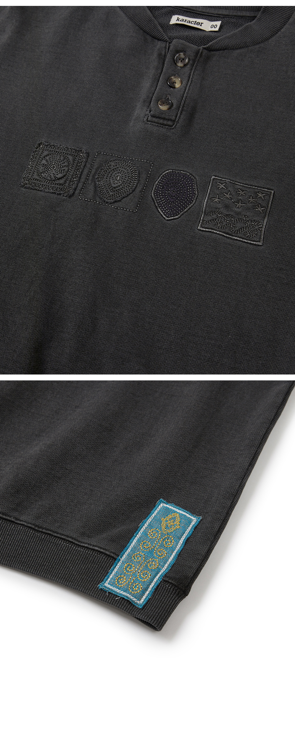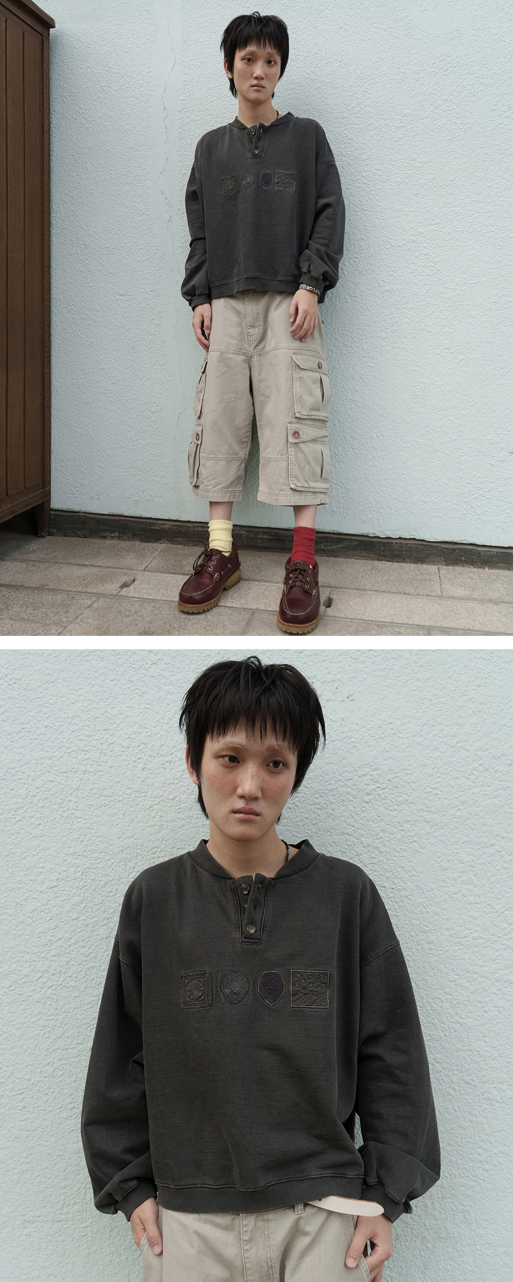 Product Info. - 탄탄하지만 소프트한 스킨십의 750g 헤비쮸리 스웻셔츠 - 여유 있는 오버핏 실루엣과 경쾌한 크롭 기장감 - 피그먼트 다잉 가공으로 유니크한 컬러감과 빈티지한 텍스처 - 전면 헨리넥 형태의 버튼 여밈, Real Cow Horn Button 사용 - 프런트 빈티지 무드의 패치워크 자수 디자인 - 후면 하단부 린넨 소재의 자수 라벨 포인트 *MODEL 176cm, wearing size 00
