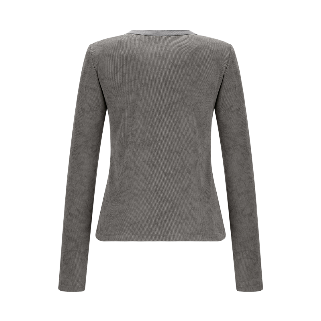 변형 립조직에 불규칙한 워싱 마크로 빈티지한 무드를 살린 헨리넥 티셔츠입니다. 노이스 금속 라벨 디테일로 포인트를 더했습니다.