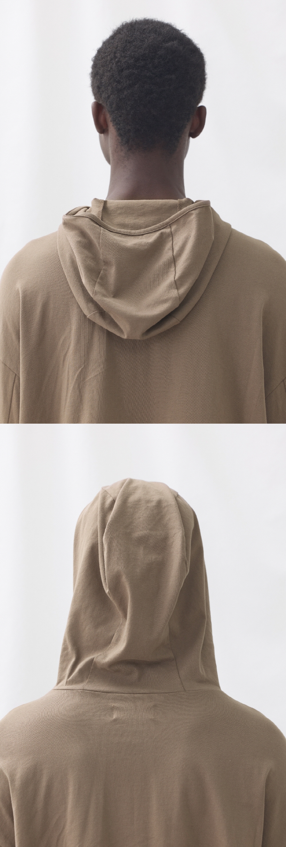 SQM/210g 적당한 두께감의 20수 싱글 원단을 사용하였습니다. 일반적인 쭈리 후드와 다른 얇은 싱글 원단으로 제작하여 다양한 아우터에 이너로 활용 가능합니다. 밑단과 소매 끝단 처리는 날라리 봉제 기법을 활용하여 내추럴한 연출이 가능합니다. Shell : Cotton 100% SIZE INFO M : 총장 68, 어깨단면 58, 가슴단면 62.5, 소매길이 57, 밑단단면 57.5 L : 총장 70, 어깨단면 60, 가슴단면 65, 소매길이 58, 밑단단면 60 MODEL INFO Model (Men1) : 184cm, 상의 M사이즈 하의 48 착용 Model (Men2) : 183cm, 상의 M사이즈 하의 48 착용