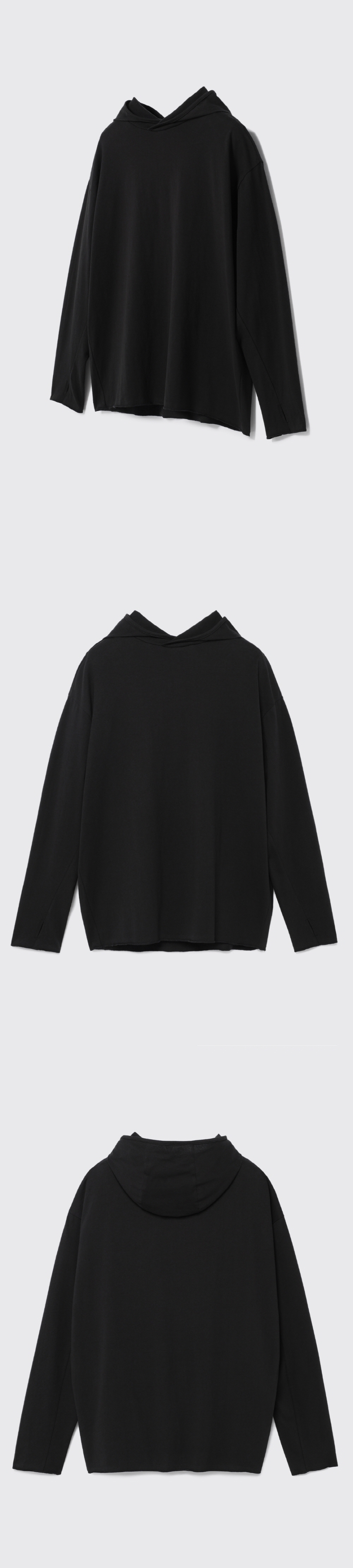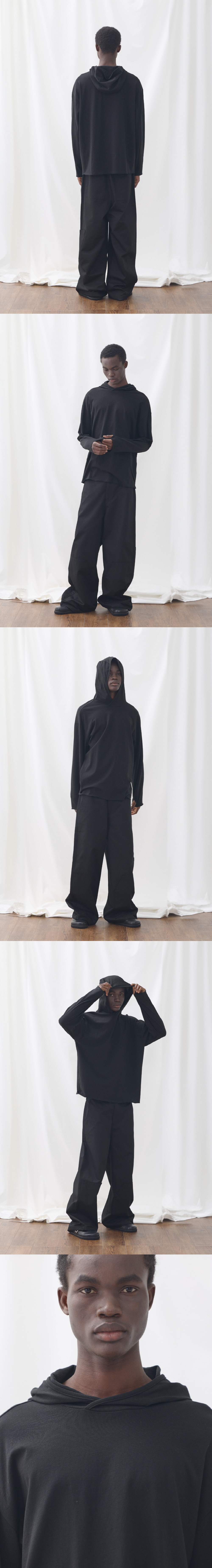 SQM/210g 적당한 두께감의 20수 싱글 원단을 사용하였습니다. 일반적인 쭈리 후드와 다른 얇은 싱글 원단으로 제작하여 다양한 아우터에 이너로 활용 가능합니다. 밑단과 소매 끝단 처리는 날라리 봉제 기법을 활용하여 내추럴한 연출이 가능합니다. Shell : Cotton 100% SIZE INFO M : 총장 68, 어깨단면 58, 가슴단면 62.5, 소매길이 57, 밑단단면 57.5 L : 총장 70, 어깨단면 60, 가슴단면 65, 소매길이 58, 밑단단면 60 MODEL INFO Model (Men1) : 184cm, 상의 M사이즈 하의 48 착용 Model (Men2) : 183cm, 상의 M사이즈 하의 48 착용