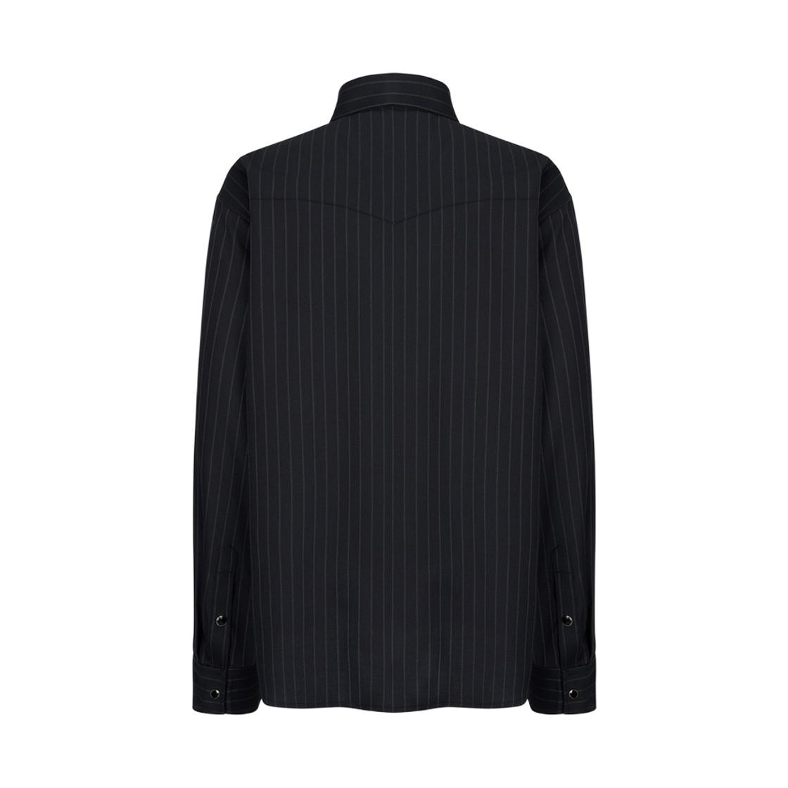 스트라이프 울 웨스턴 셔츠입니다. 울 소재로 고급스러운 텍스쳐가 특징이며, 자개 단추로 룩의 완성도를 높였습니다.