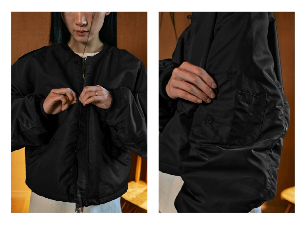 - 차이나카라 디자인에 크롭한 기장의 MA-1 자켓 - 은은하고 부드러운 터치감의 나일론 원단 사용 - 나일론 원단 견장 디테일 - 몸판 2oz 하스 충전재 사용 Shell : Nylon 100% 세탁 전문점에서의 드라이클리닝을 권장합니다. 기계 건조기를 사용하지 마십시오. 염소, 산소계 표백제로 표백하지 마십시오. 건조 시 옷걸이 걸지 마시고 그늘에 뉘여서 건조하십시오. 다림질을 하지 마십시오. 크롭 오버핏 S : 총장 59.5, 어깨단면 61.5, 가슴단면 62.5, 소매길이 62.5, 밑단단면 55.5 M : 총장 61.5, 어깨단면 63.5, 가슴단면 65, 소매길이 64, 밑단단면 58 L : 총장 63.5, 어깨단면 65.5, 가슴단면 67.5, 소매길이 65.5, 밑단단면 60.5