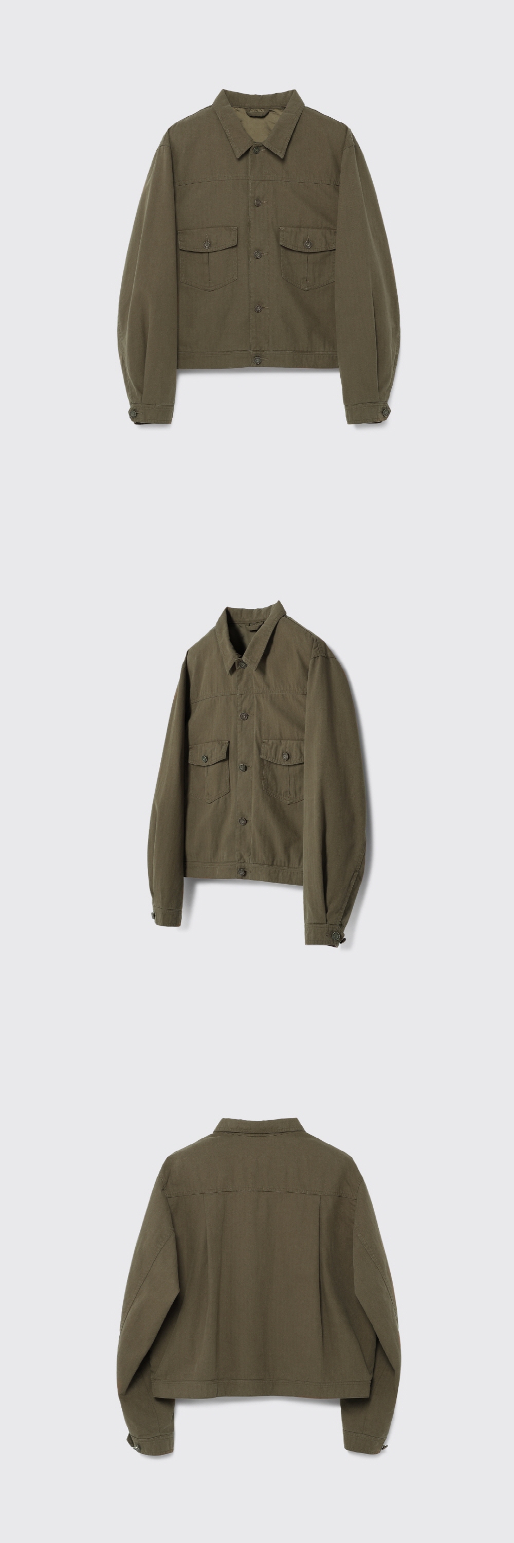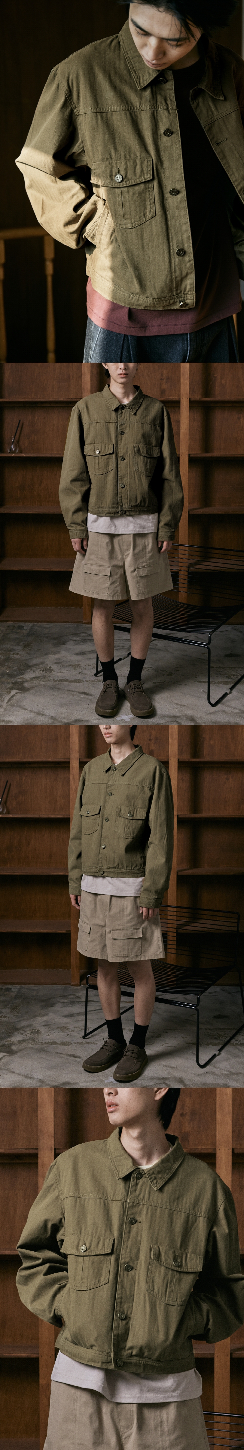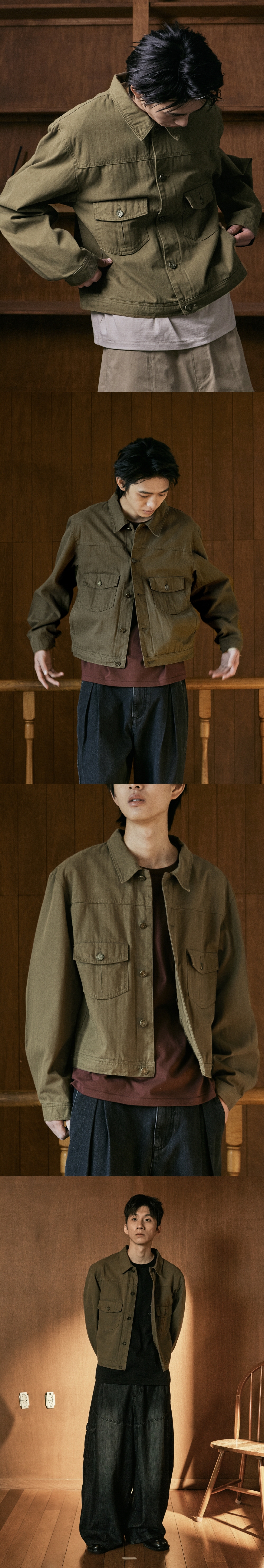 빈티지한 색감을 위해 바이오 워싱을 작업을 한 원단이 돋보이는 트러커 자켓. 오버한 품에 비해 크롭한 기장감으로 트렌디한 스타일이 연출 가능합니다. 고밀도의 트윌 안감을 사용하여 고급스러움을 연출 하였습니다. 엔틱한 느낌의 캔톤을 사용하여 빈티지한 느낌을 더 했습니다. 몸판에 후다 포켓을 추가하여 수납 공간을 넉넉하게 제작했습니다. Shell : Cotton 100% SIZE INFO S : 총장 59, 어깨단면 48.5, 가슴단면 56, 소매길이 64, 밑단단면 52.5 M : 총장 61, 어깨단면 50.5, 가슴단면 58.5, 소매길이 65.5, 밑단단면 55.5 L : 총장 63, 어깨단면 52.5, 가슴단면 61, 소매길이 67, 밑단단면 57.5 MODEL INFO Model (Men1) : 184cm, 상의 M사이즈 하의 48 착용 Model (Men2) : 183cm, 상의 M사이즈 하의 48 착용