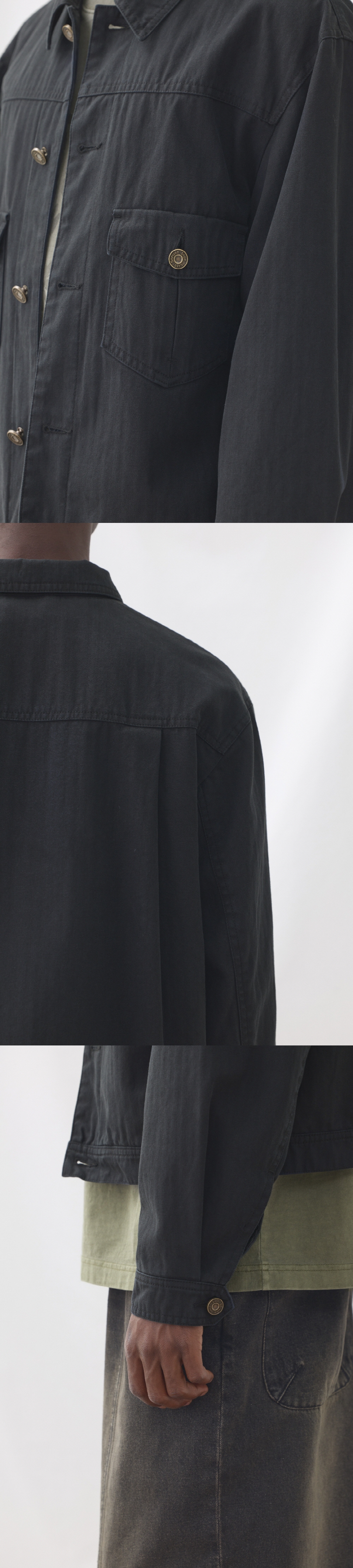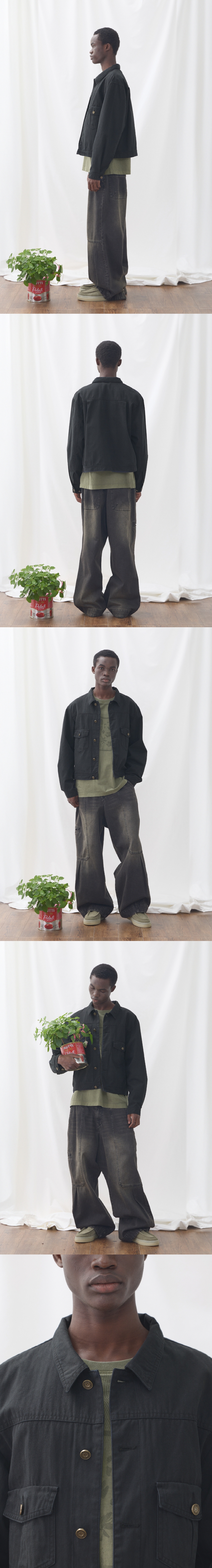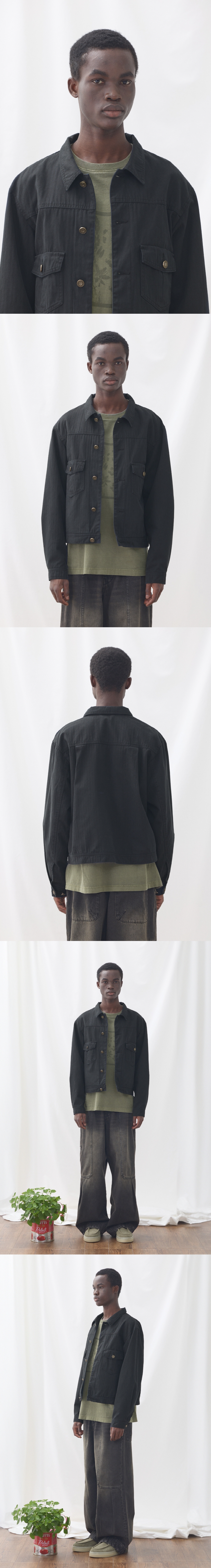 빈티지한 색감을 위해 바이오 워싱을 작업을 한 원단이 돋보이는 트러커 자켓. 오버한 품에 비해 크롭한 기장감으로 트렌디한 스타일이 연출 가능합니다. 고밀도의 트윌 안감을 사용하여 고급스러움을 연출 하였습니다. 엔틱한 느낌의 캔톤을 사용하여 빈티지한 느낌을 더 했습니다. 몸판에 후다 포켓을 추가하여 수납 공간을 넉넉하게 제작했습니다. Shell : Cotton 100% SIZE INFO S : 총장 59, 어깨단면 48.5, 가슴단면 56, 소매길이 64, 밑단단면 52.5 M : 총장 61, 어깨단면 50.5, 가슴단면 58.5, 소매길이 65.5, 밑단단면 55.5 L : 총장 63, 어깨단면 52.5, 가슴단면 61, 소매길이 67, 밑단단면 57.5 MODEL INFO Model (Men1) : 184cm, 상의 M사이즈 하의 48 착용 Model (Men2) : 183cm, 상의 M사이즈 하의 48 착용