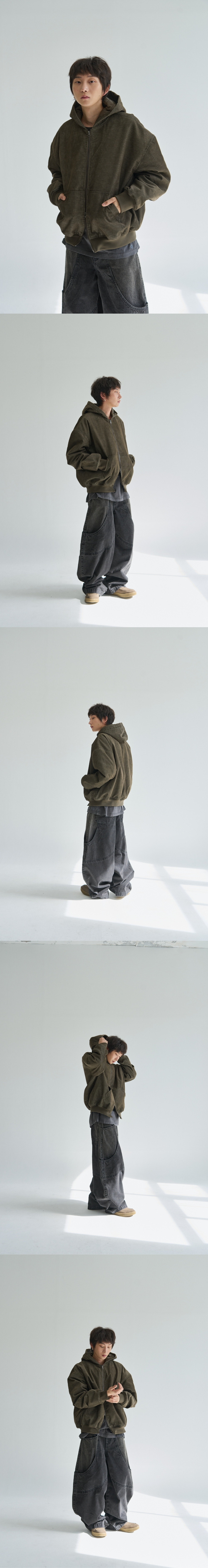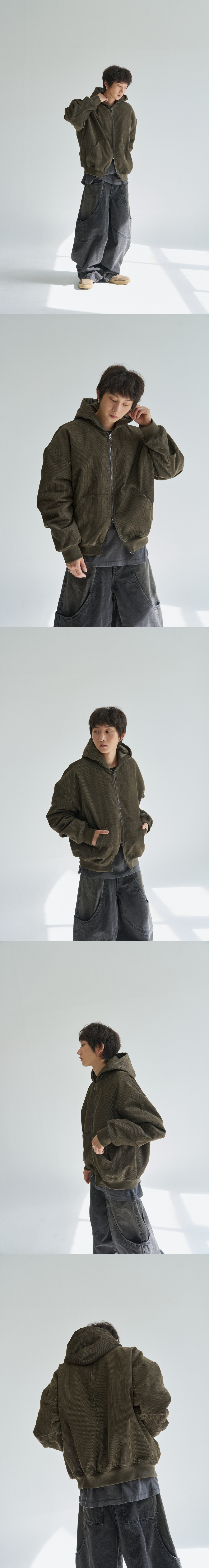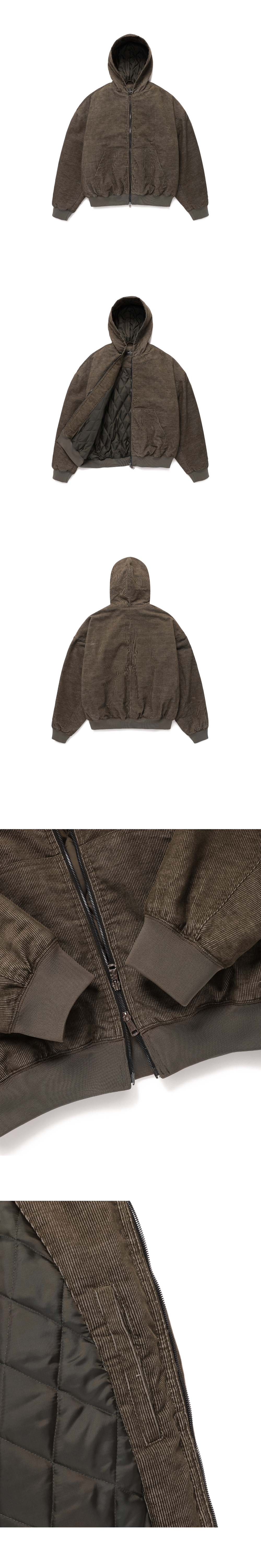 빈티지한 색감의 워싱 된 듯한 코듀로이 원단이 돋보이는 후디 봄버 자켓 퀼팅 안감을 사용하여 볼륨감 있는 실루엣을 연출 세미 크롭 오버핏 실루엣과 드롭되는 어깨라인으로 캐쥬얼한 디자인 YKK사의 2WAY 지퍼를 사용하여 기호에 맞는 지퍼 스타일을 연출 가능 톤온톤으로 매칭된 시보리를 사용하여 방풍기능이 있는 디자인 Shell : Cotton 65% Polyester 35% SIZE INFO S : 총장 64.5, 어깨단면 66.5, 가슴단면 70, 소매길이 60.5, 밑단단면 41.75 M : 총장 66.5, 어깨단면 68.5, 가슴단면 72.5, 소매길이 62, 밑단단면 44.25 L : 총장 68.5, 어깨단면 70.5, 가슴단면 75, 소매길이 63.5, 밑단단면 46.75 MODEL INFO Model (Men1) : 179cm, 60KG 상의 M사이즈 하의 48 착용