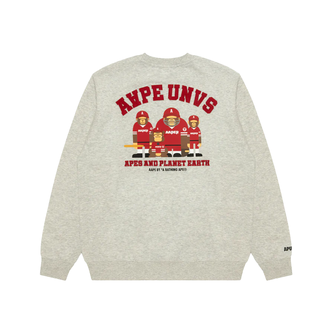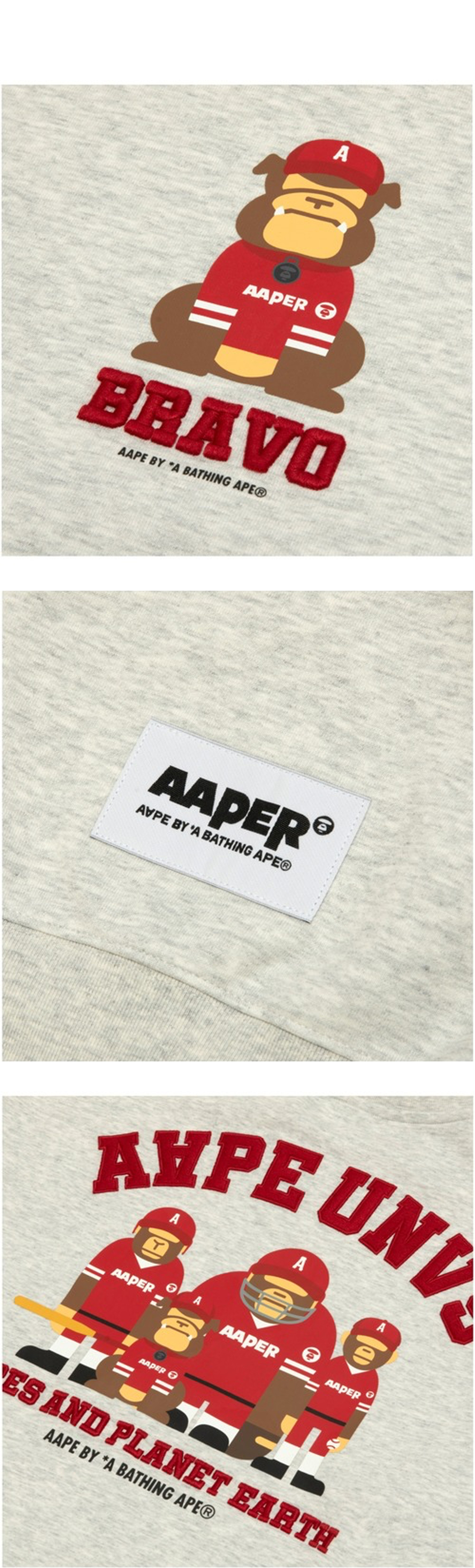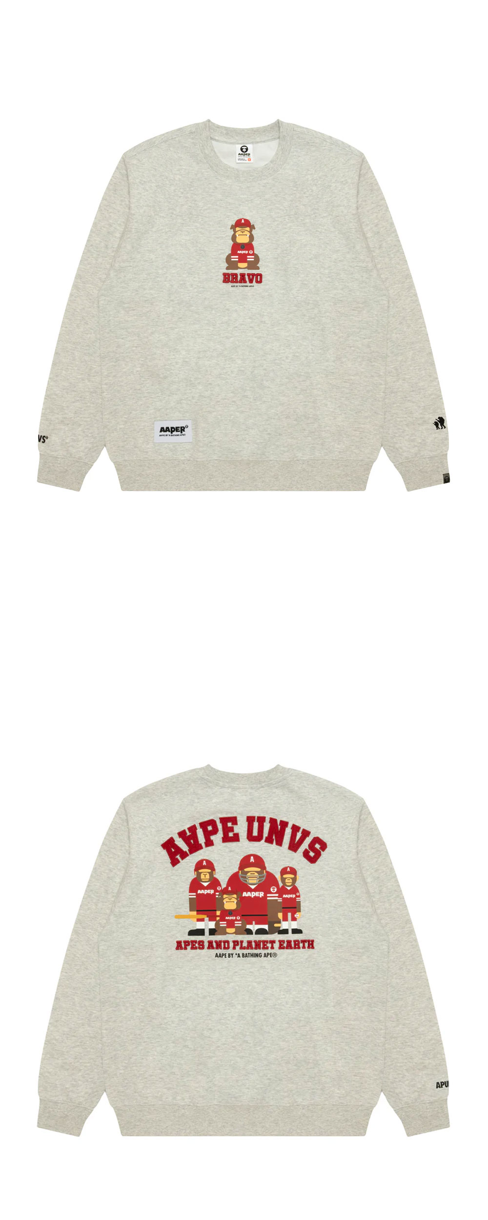 브라보 캐릭터 프린팅이 인상적인 에이프 에이퍼 크루 넥 스웨터 헤더 화이트입니다. - AAPE 오리지널 캐릭터 BRAVO 프린트 (전면) - 로고 & 문구 자수 디테일 - AAPE FAMILY 백 프린트 - 기모 없는 얇은 소재 - 간절기용 크루넥 스웻셔츠