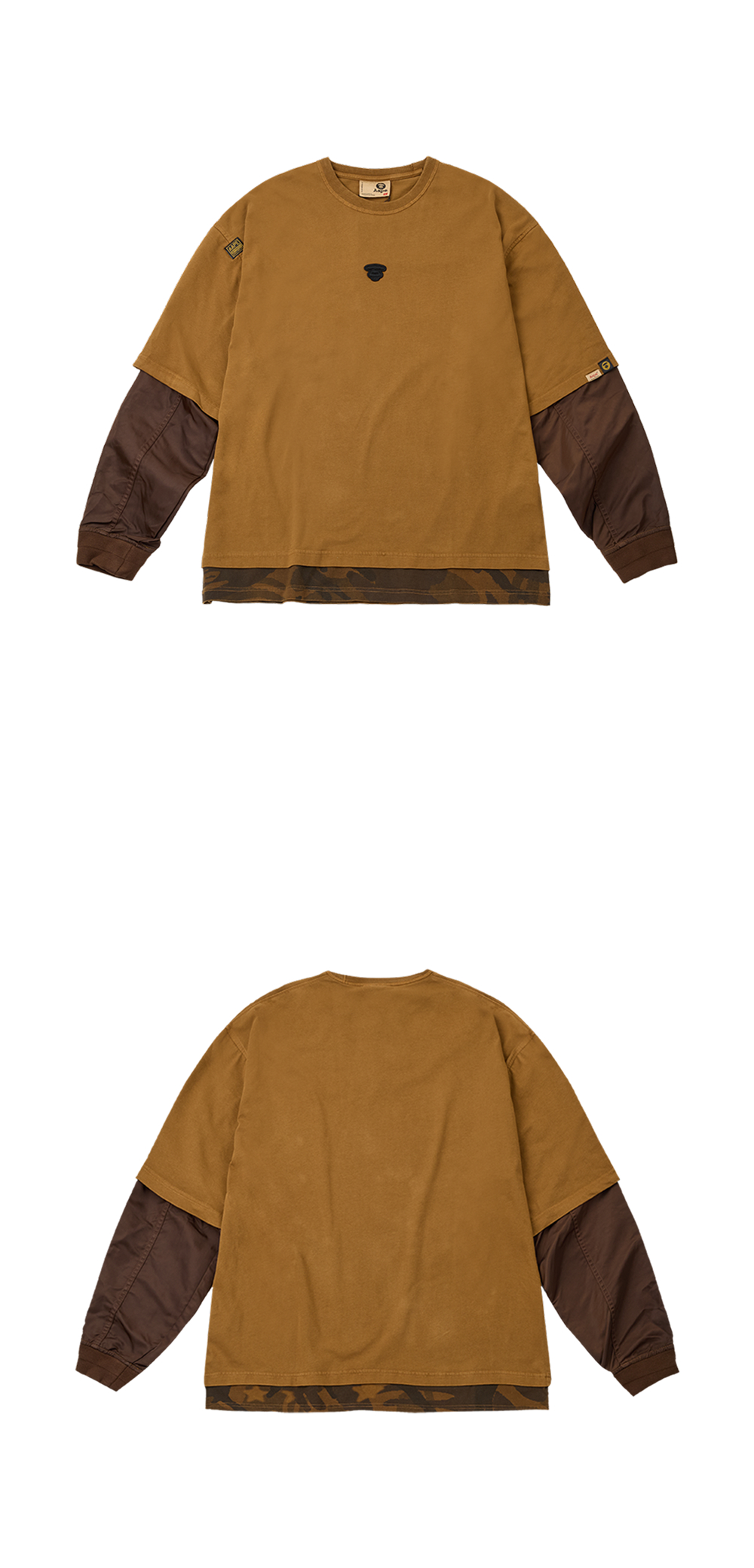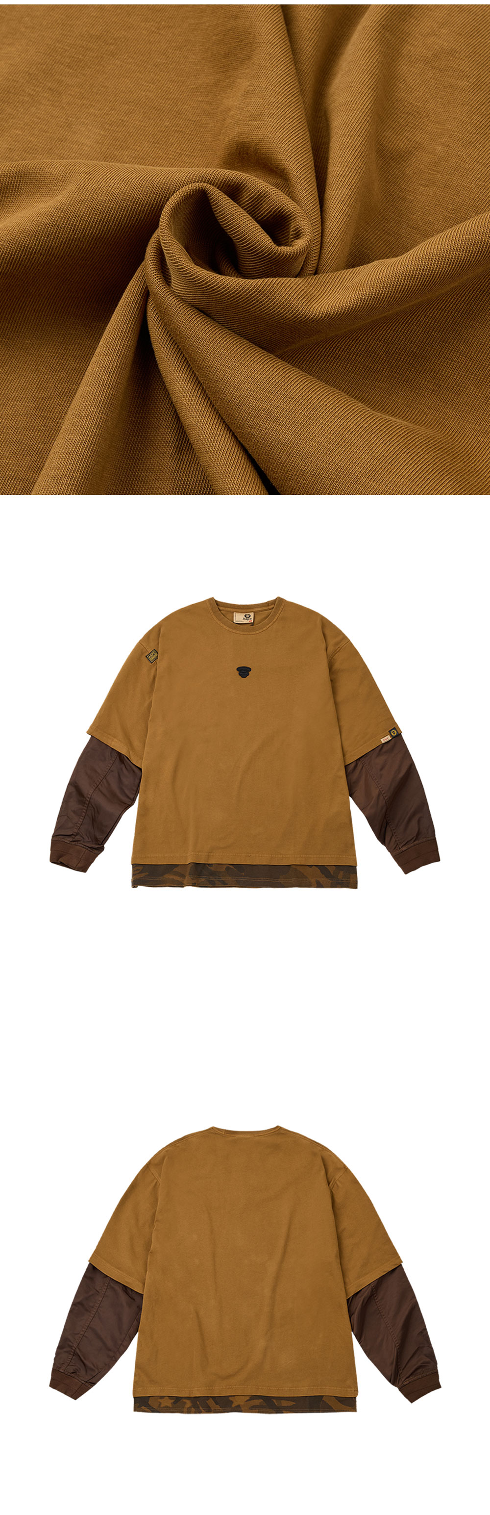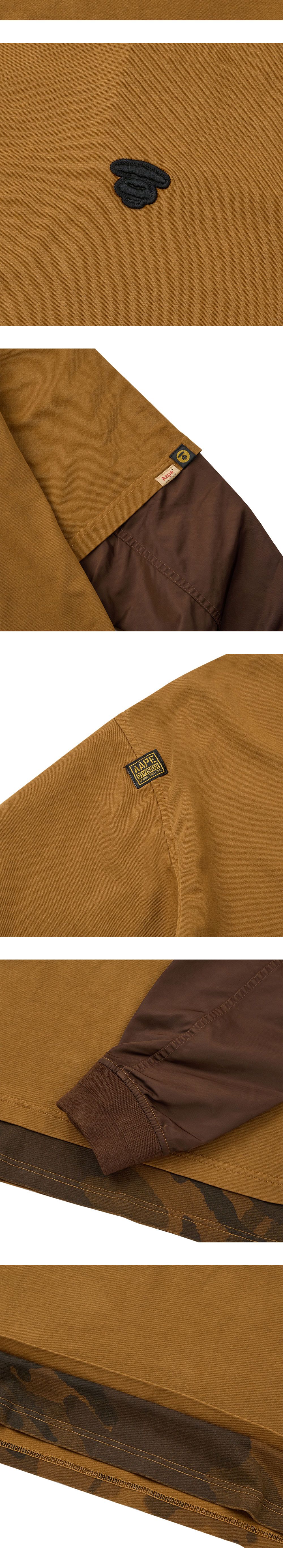 에이프 팬시 메인 롱 티 라이트 브라운입니다. - MA-1 자켓 위에 티셔츠를 레이어드한 듯한 디자인 - 밑단 카모플라주 레이어드로 완성한 밀리터리 무드 - 여유로운 오버사이즈 실루엣 - 소매 부분 나일론 원단 믹스
