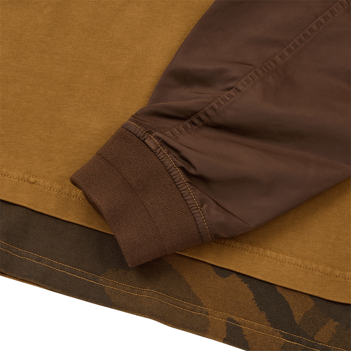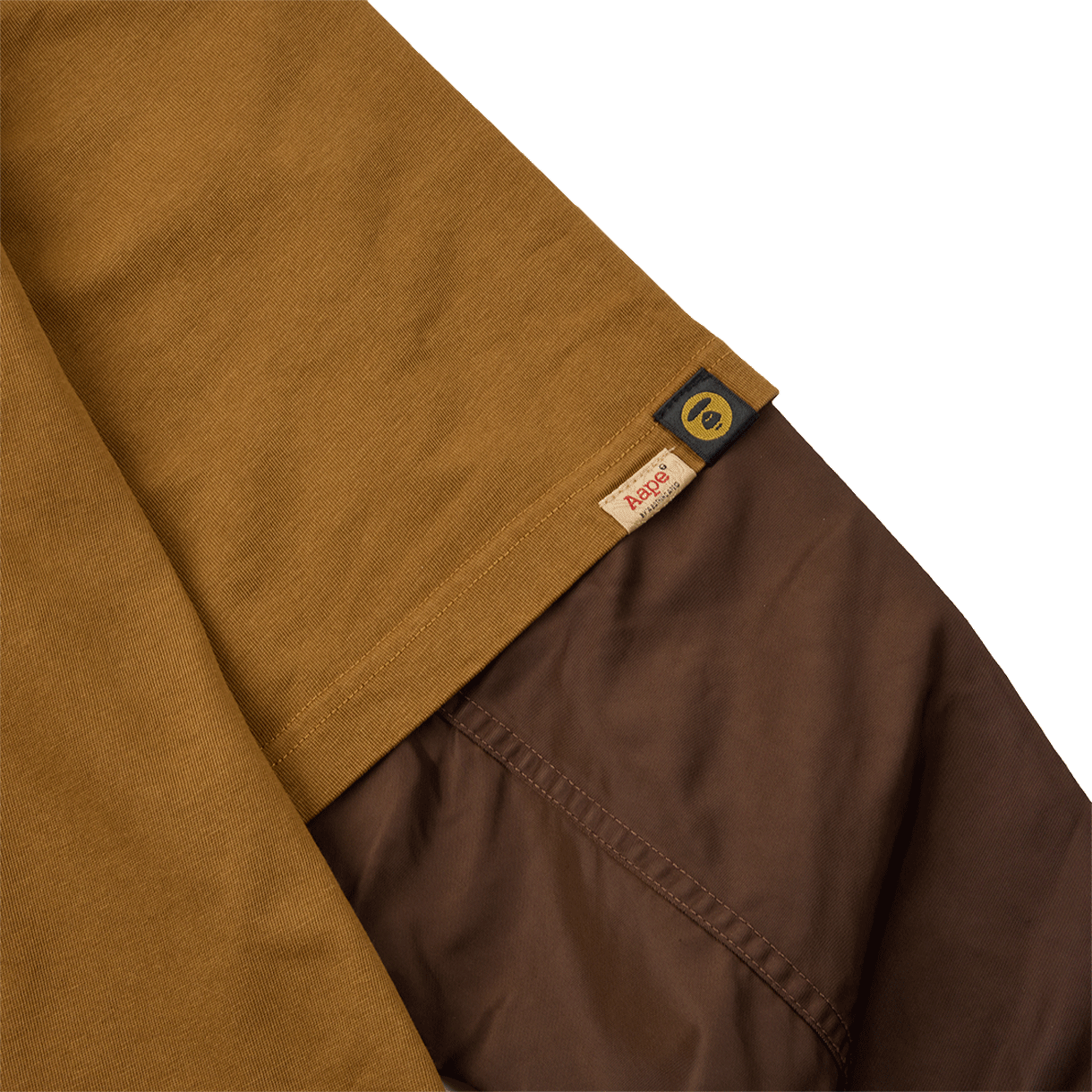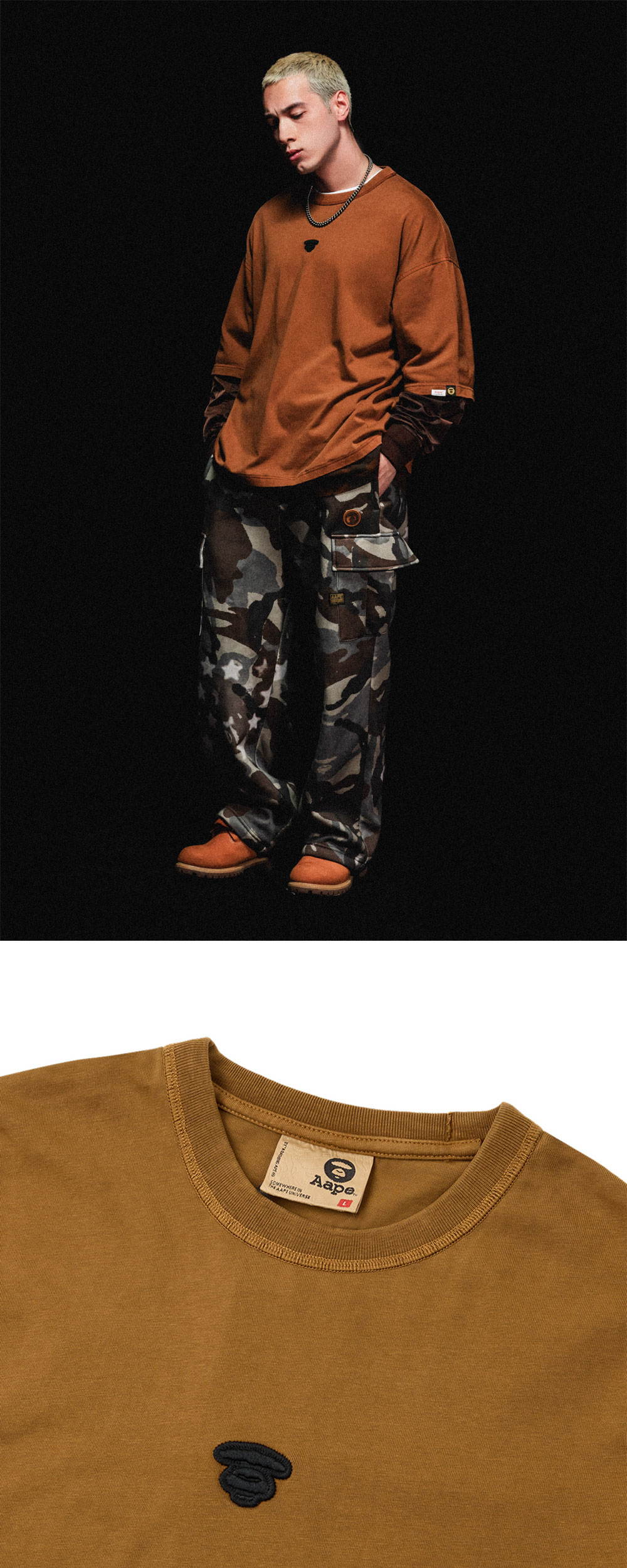 에이프 팬시 메인 롱 티 라이트 브라운입니다. - MA-1 자켓 위에 티셔츠를 레이어드한 듯한 디자인 - 밑단 카모플라주 레이어드로 완성한 밀리터리 무드 - 여유로운 오버사이즈 실루엣 - 소매 부분 나일론 원단 믹스