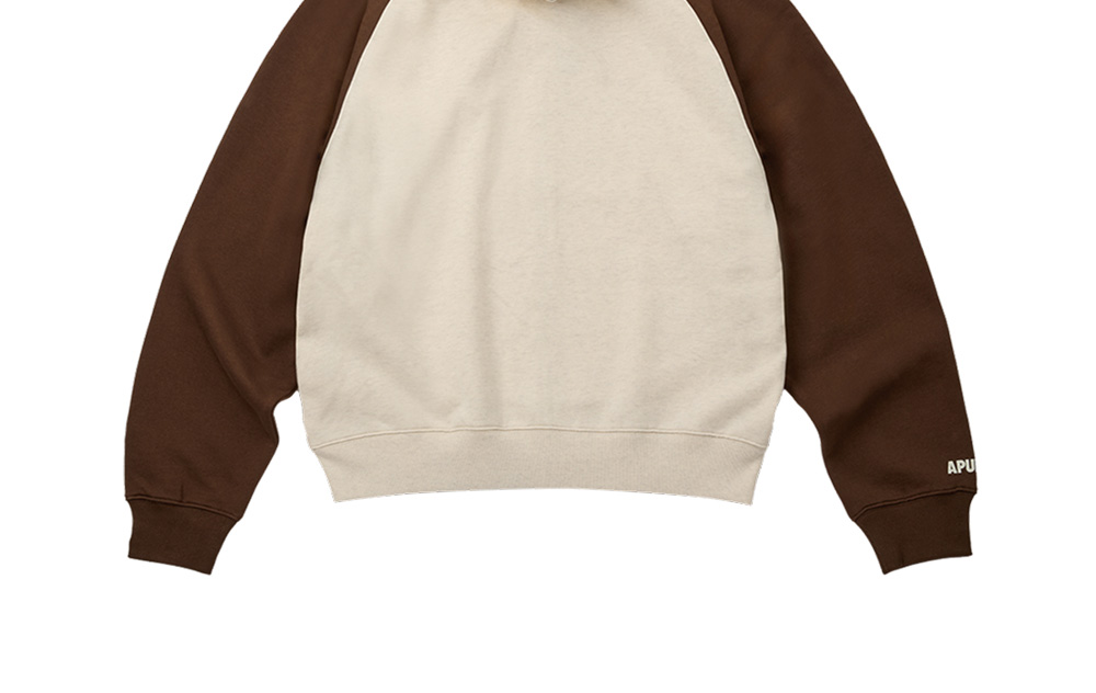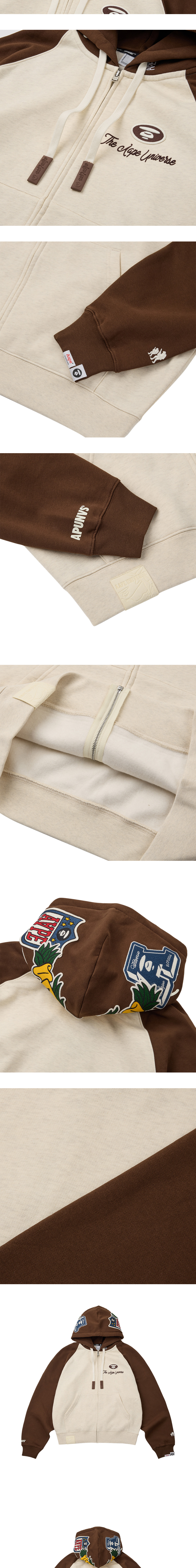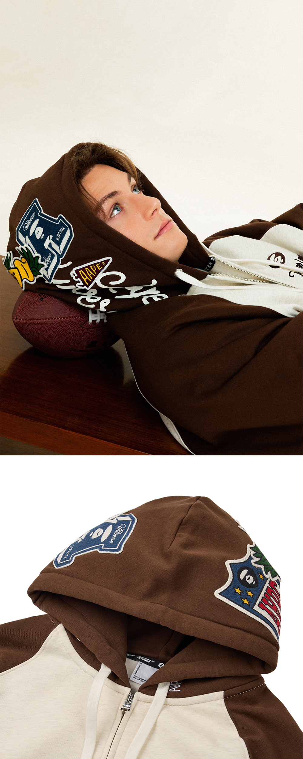 에이프 메인 후디 다크 브라운입니다. - 브라운·크림 배색의 래글런 디자인 - 부드럽고 탄탄한 코튼 혼방 소재 - 후드 AAPE 그래픽 와펜 디테일 - 가슴의 The Aape Universe 자수 와펜 포인트