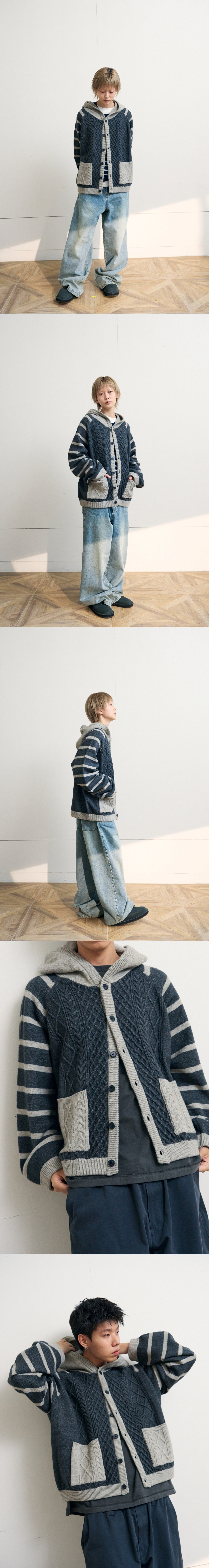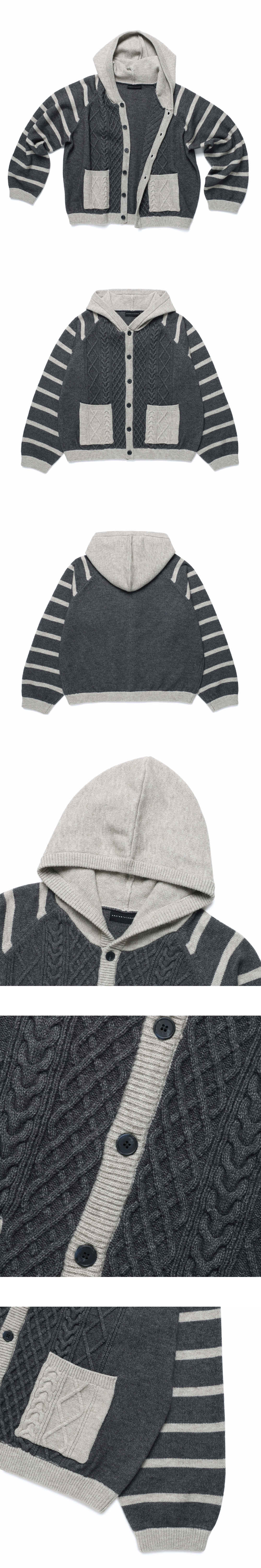 이스트서비스샵 스트라이프 케이블 니트 후드 가디건 트러플 그레이