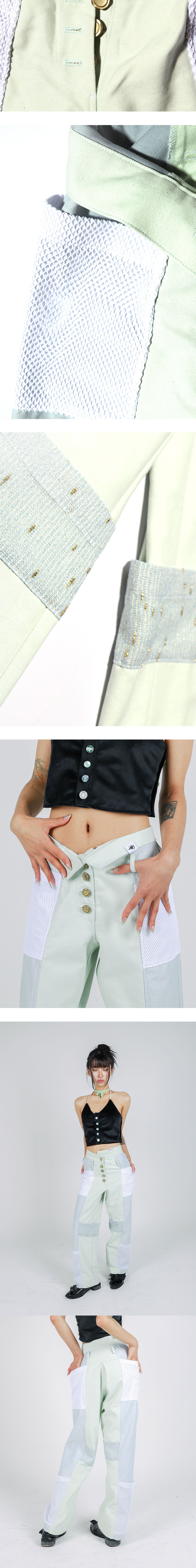 Designer's notes ⟡ 책의 각주(footnote)를 모티브로 디자인한 팬츠입니다. ⟡ 팬츠의 기본 바디에 붙은 다양한 패턴의 사각 사이드 포켓은 책 본문에 붙여진 메모들을 표현합니다. ⟡ 비정형으로 체결되는 앞섶 단추 여밈 부는 접힌 책 페이지의 모서리를 나타냅니다. ⟡ Pants designed with the motif of a book’s footnotes. ⟡ The various patterned square side pockets attached to the main body of the pants represent the notes found alongside a book’s text. ⟡ The asymmetrically fastened front button closure evokes the folded corners of book pages. Made by Allegoriker ® Designed by Allegoriker ©