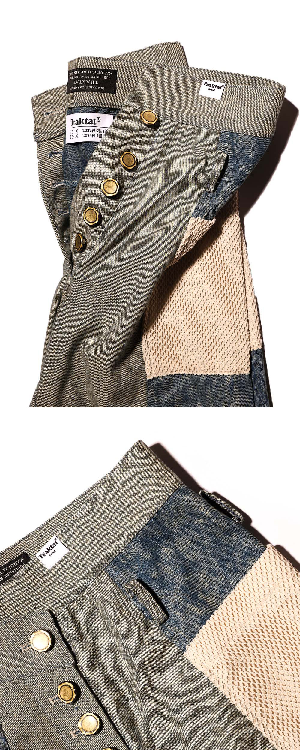 Designer's notes ⟡ 책의 각주(footnote)를 모티브로 디자인한 팬츠입니다. ⟡ 팬츠의 기본 바디에 붙은 다양한 패턴의 사각 사이드 포켓은 책 본문에 붙여진 메모들을 표현합니다. ⟡ 비정형으로 체결되는 앞섶 단추 여밈 부는 접힌 책 페이지의 모서리를 나타냅니다. ⟡ Pants designed with the motif of a book’s footnotes. ⟡ The various patterned square side pockets attached to the main body of the pants represent the notes found alongside a book’s text. ⟡ The asymmetrically fastened front button closure evokes the folded corners of book pages. Made by Allegoriker ® Designed by Allegoriker ©