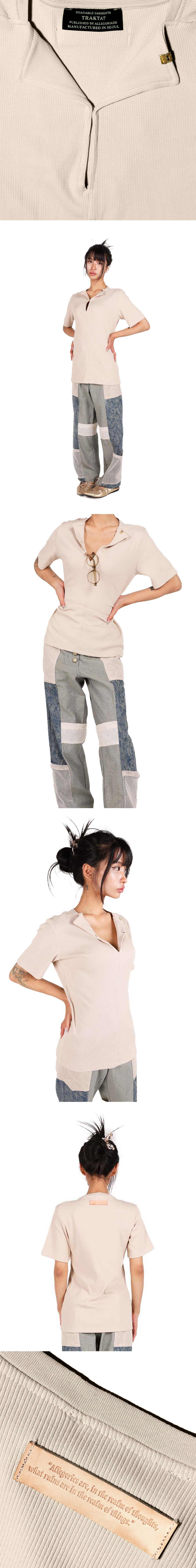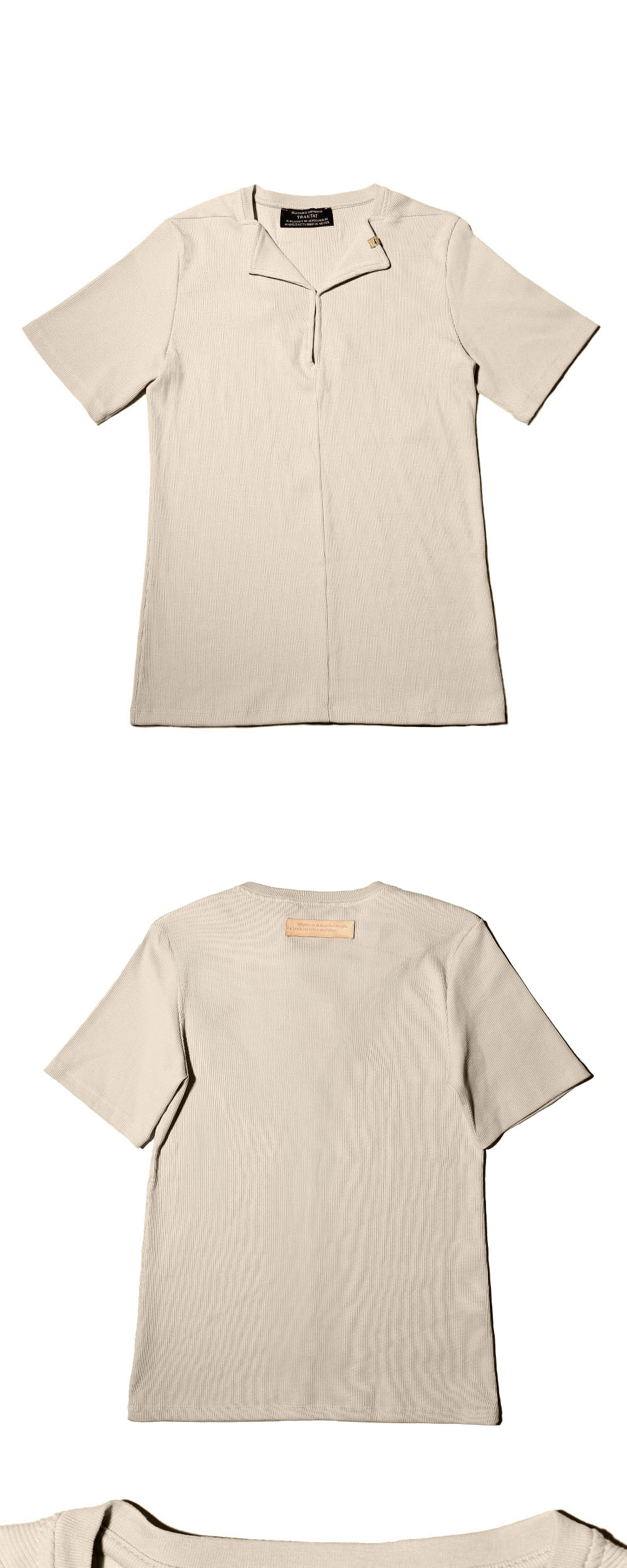 Designer's notes ⟡ 가슴선까지 절개를 주어 바깥 방향으로 크게 접히도록 한 넥라인은 접힌 페이지의 모서리를 나타냅니다. ⟡ 뒷면 목라인에는 철학자 발터 벤야민의 단상이 새겨진 소가죽 패치를 부착해 미주(Endnote)를 달았습니다. ⟡ The neckline, seamed up to the chest and folded outward in a wide turn, represents the corner of a folded page. ⟡ On the back neckline, a cowhide patch embossed with a reflection by philosopher Walter Benjamin serves as an endnote. Made by Allegoriker ® Designed by Allegoriker ©