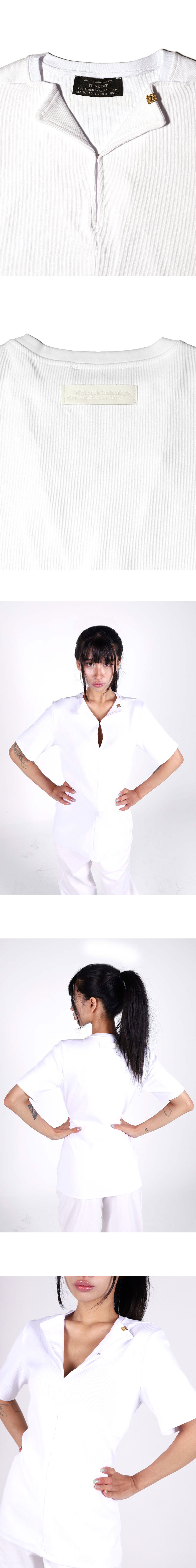 Designer's notes ⟡ 가슴선까지 절개를 주어 바깥 방향으로 크게 접히도록 한 넥라인은 접힌 페이지의 모서리를 나타냅니다. ⟡ 뒷면 목라인에는 철학자 발터 벤야민의 단상이 새겨진 소가죽 패치를 부착해 미주(Endnote)를 달았습니다. ⟡ The neckline, seamed up to the chest and folded outward in a wide turn, represents the corner of a folded page. ⟡ On the back neckline, a cowhide patch embossed with a reflection by philosopher Walter Benjamin serves as an endnote. Made by Allegoriker ® Designed by Allegoriker ©