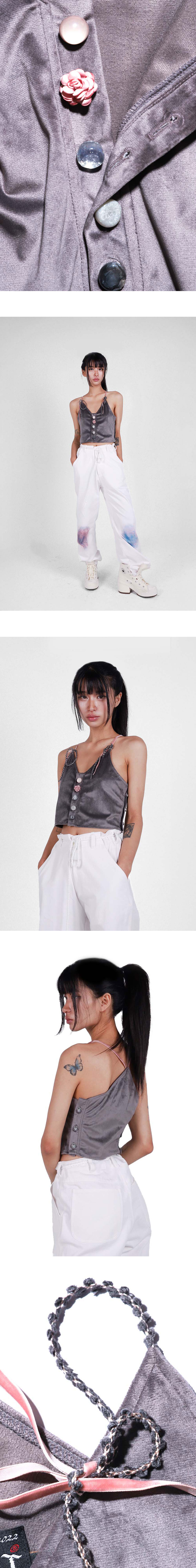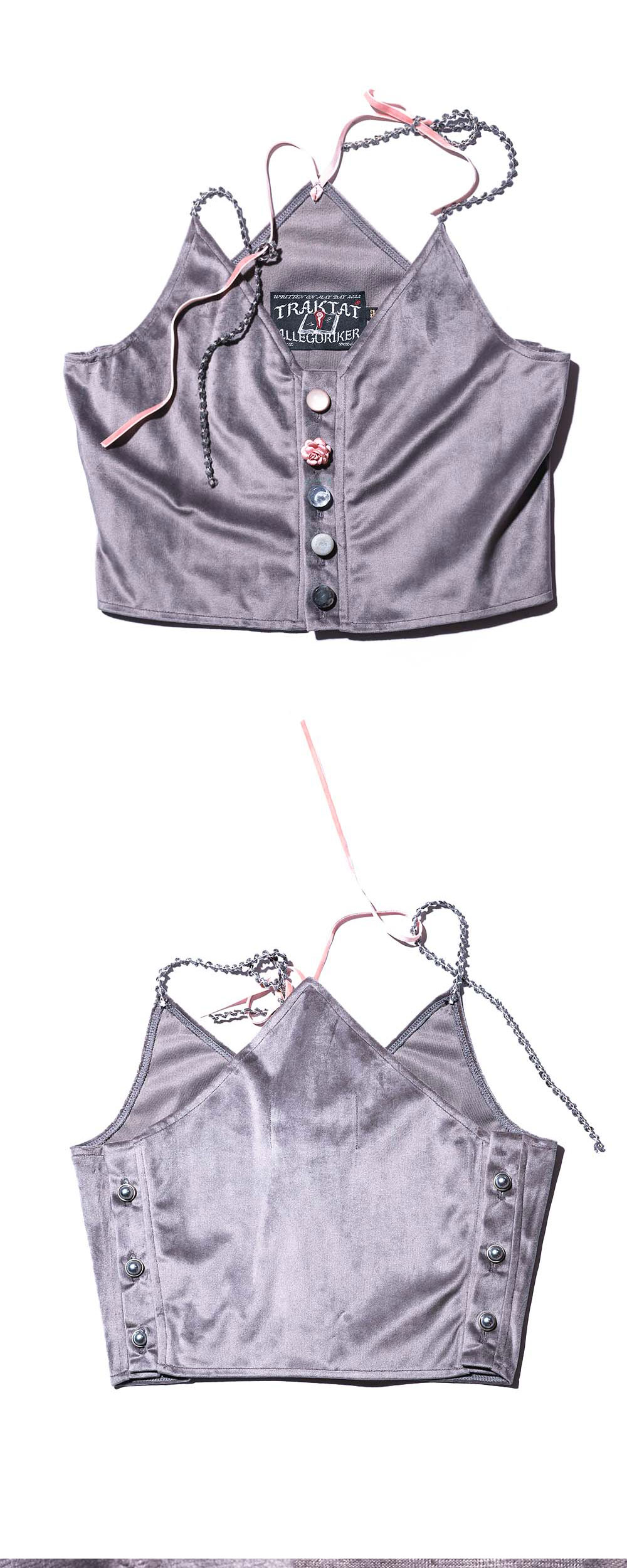 Designer's notes ⟡ 뾰족하게 솟은 상단 실루엣에 착안, 채도가 낮은 벨벳 원단을 채택하여 어스름하고 포근한 산의 형상을 그립니다. ⟡ 절개부에 달과 꽃, 원석, 열매 등을 연상시키는 단추를 부착해 어스름의 산을 채웠습니다. ⟡ Inspired by the sharply pointed upper silhouette, low-saturation velvet fabric is used to evoke the dim yet cozy form of a mountain. ⟡ Buttons reminiscent of the moon, flowers, raw stones, and fruits are attached along the seams, filling the dusky mountain. Made by Allegoriker ® Designed by Allegoriker ©