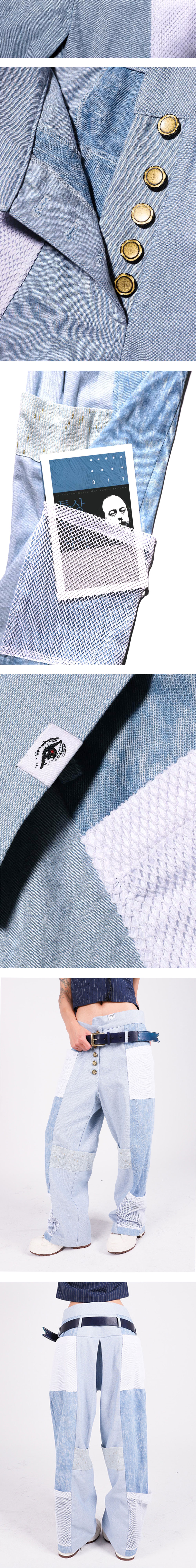 Designer's notes ⟡ 책의 각주(footnote)를 모티브로 디자인한 팬츠입니다. ⟡ 팬츠의 기본 바디에 붙은 다양한 패턴의 사각 사이드 포켓은 책 본문에 붙여진 메모들을 표현합니다. ⟡ 비정형으로 체결되는 앞섶 단추 여밈 부는 접힌 책 페이지의 모서리를 나타냅니다. ⟡ Pants designed with the motif of a book’s footnotes. ⟡ The various patterned square side pockets attached to the main body of the pants represent the notes found alongside a book’s text. ⟡ The asymmetrically fastened front button closure evokes the folded corners of book pages. Made by Allegoriker ® Designed by Allegoriker ©